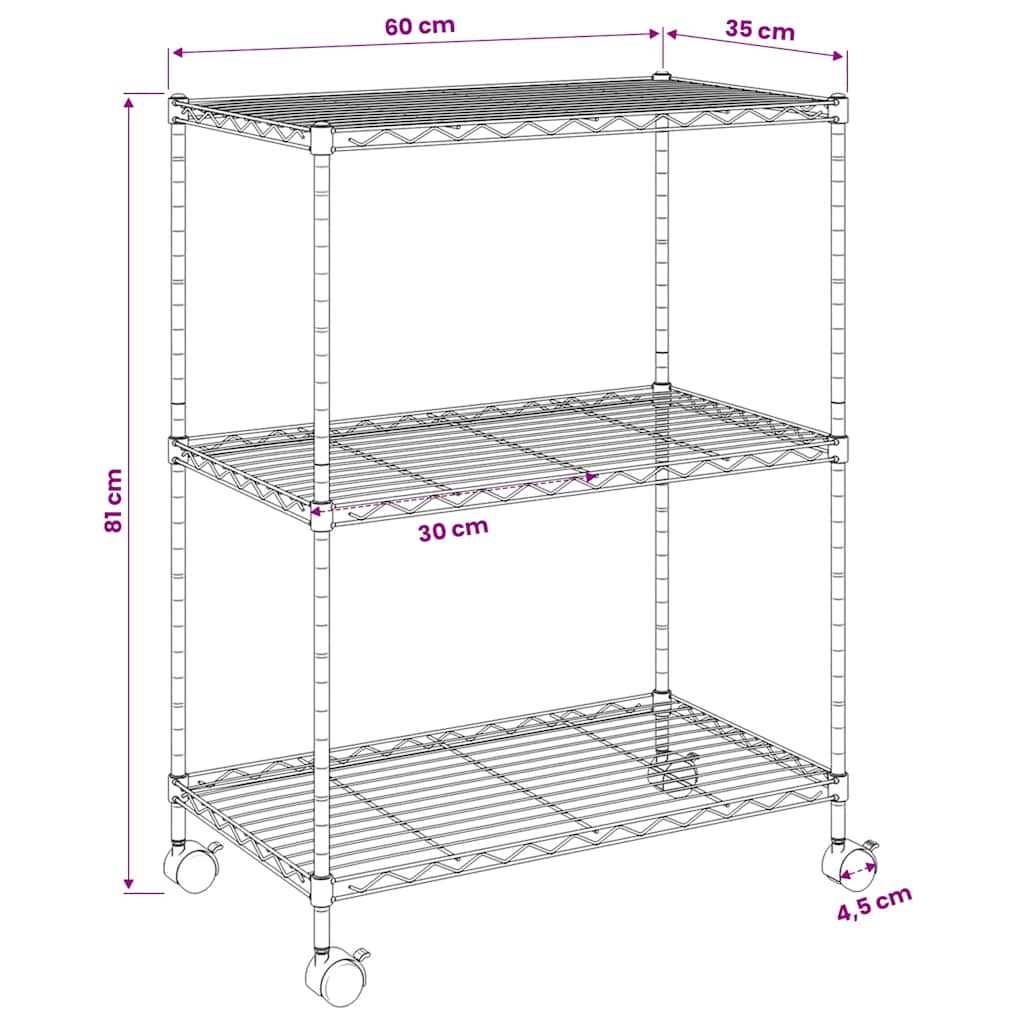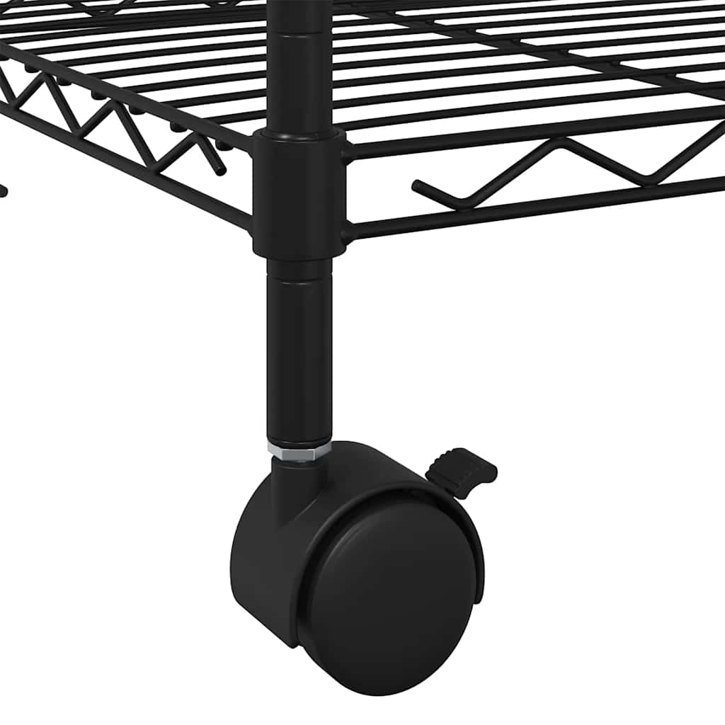 To mrežasto stojalo s policami je idealna rešitev za shranjevanje doma in drugje, na primer v kuhinji, pralnici, kleti, kopalnici, pisarni, garaži, delavnici ali v katerem koli drugem prostoru, v katerem potrebujete dodaten prostor za shranjevanje, saj ponuja veliko prostora za organizirano shranjevanje stvari. Stojalo s policami je izdelano iz železa s črnim premazom in je izjemno vzdržljivo! Industrijski regal ima 4 kolesa za enostavno premikanje. Tega izdelka ne uporabljajte, če je katera koli komponenta polomljena, strgana ali manjka.