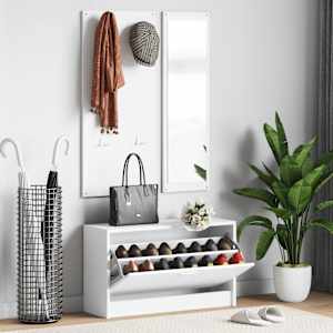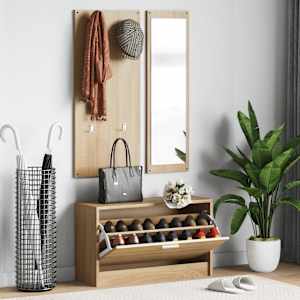 Ta 3 v 1 komplet omar za čevlje je sestavljen iz elegantne omarice za čevlje, stenskega ogledala in obešalnika za plašče, ki ponuja nešteto rešitev za shranjevanje. Trden material: Inženirski les se ponaša z izjemno kakovostjo, gladko površino ter močjo, stabilnostjo in odpornostjo na vlago.Veliko prostora za shranjevanje: Omarica za čevlje ima velik predelek s sredinsko pregrado, da so stvari organizirane. Tako vas ne bodo več motili čevlji, ki so prej ležali na tleh.Praktična zasnova: Obešalo za plašče je opremljeno s 4 robustnimi kavlji za plašče, torbe, klobuke, šale in druge stvari za na pot. Ogledalo je dovolj veliko, da boste lahko dobro urejeni. Opomba:Vsakemu izdelku je priložen priročnik za enostavno sestavljanje.
