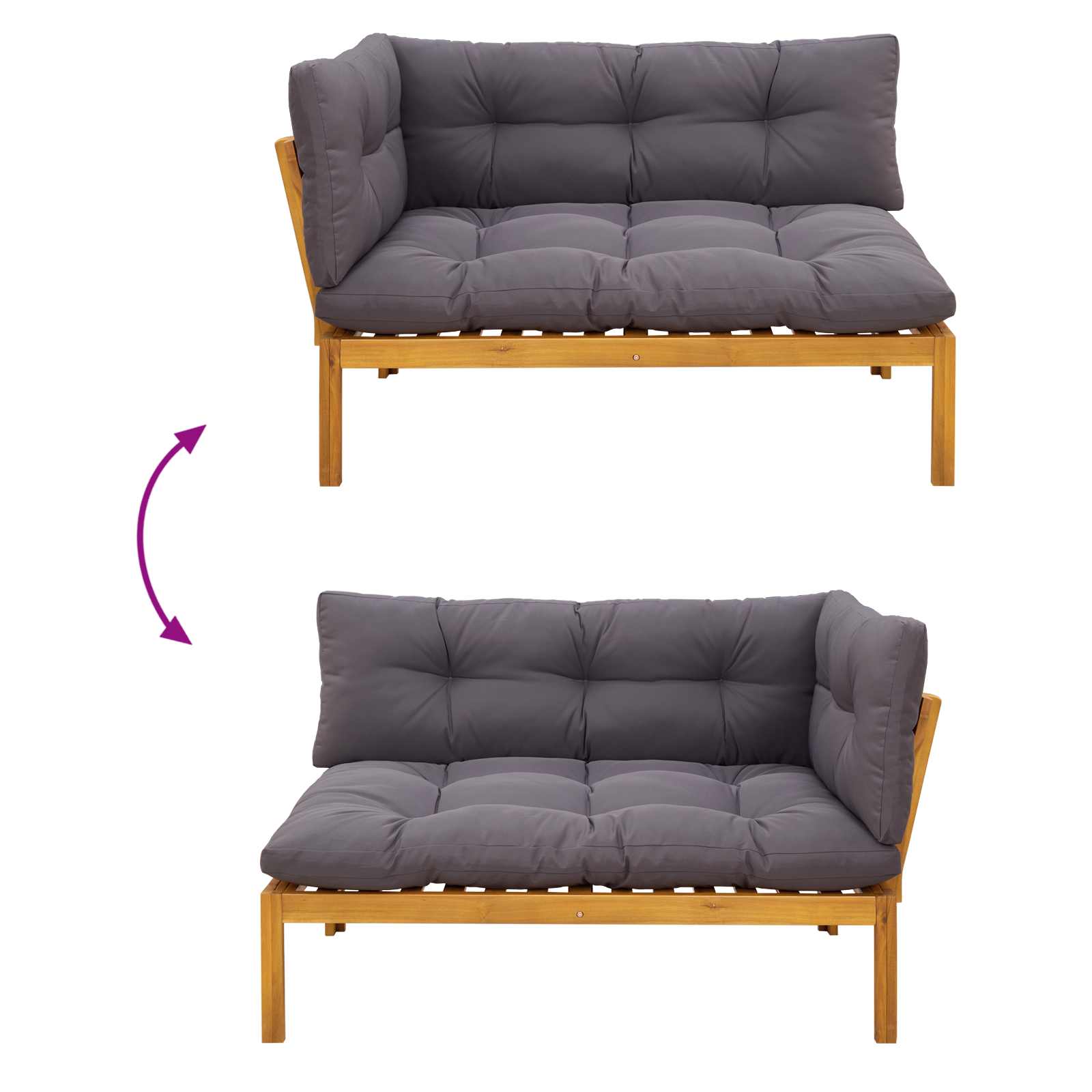 Ta rustikalni vrtni kavč iz palet je oblikovan za udobno sedenje na prostem, z naravnim videzom, ki pritegne pogled. Narejen iz trdnega akacijevega lesa, okvir pokaže tople odtenke in značilne vzorce lesa, ki se odlično ujemajo z vrtnarskimi, patio ali terasnimi prostori. Kotna zasnova ustvarja sproščen prostor za druženje, medtem ko priložena nizka miza ponuja priročno mesto za pijače ali manjše predmete. Blazine iz penastega materiala in rahlo nagnjeno naslonjalo zagotavljajo udobno sedenje za vsakodnevno sprostitev zunaj. Trdna konstrukcija iz akacijevega lesa Okvir, naslonjalo, noge in površina so izdelani iz trdnega akacijevega lesa, znanega po svoji naravni odpornosti in značilni teksturi. Ta les daje prijeten, vroč videz in zagotavlja stabilno strukturo za zunanjo uporabo. Fiksna mrežasta zasnova Zasnova z nefleksibilnimi letvami nudi trdno podporo za udobno sedenje in je primerna za redno uporabo na prostem. Vremensko odporne lastnosti Kavč je zasnovan za zunanje okolje in pomaga ohraniti svoj videz ter strukturo skozi vse letne čase. Primerno je za rabo v sončnih ali deževnih dneh, kar omogoča dolgoročno uporabo na prostem. Kotna lounge postavitev s priloženo mizo Njegova kotna zasnova optimizira zunanji prostor in hkrati ustvari sproščen lounge prostor. Nizka miza je vključena, da omogoči priročno površino za pijače, prigrizke ali dekoracijo. Enostavna vzdrževanje Le obrišite kavč z vlažno krpo, da ohranite njegov videz pri vsakodnevni rabi. Minimalna potreba po vzdrževanju omogoča, da bo idealen za redno uporabo na prostem. Največ 110 kg na sedež.