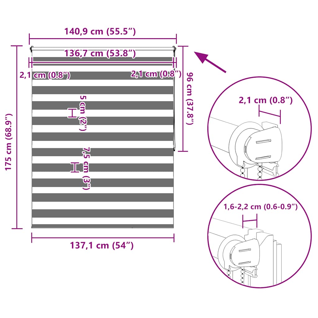 Ta elegantna roleta za zatemnitev oken je pametna odločitev za moderen dom, saj je lahko stilska alternativa tradicionalnim žaluzijam ali vertikalnim zavesam. Senčilo ima dve izmenični paralelni plasti netransparentnega in transparentnega blaga. S preprostim nastavljanjem pozicije rolete, lahko po želji namestite zadnje in sprednje netransparentne in transparentne sloje na tak način, da boste ustvarili edinstvene svetlobne učinke, ki so primerni za katerikoli sodoben bivalni prostor. Senčilo je narejeno iz 100% poliestra. Ima tudi belo verigo za preprosto upravljanje. Širina zgornje palice, vključno s pripomočki za montažo, bo 3 cm širša, kot pa širina rolete. Dostava vsebuje 1 x 140 cm zgornji aluminijasti drog s 137 x 175 cm velikim črtastim senčilom, 1 x 140 cm zgornji drog, 1 x 140 cm močan spodnji drog, 2 x kavelj, 2 x nosilec 2 x tesnilo in 1 x plastična veriga iz kroglic. GPSR