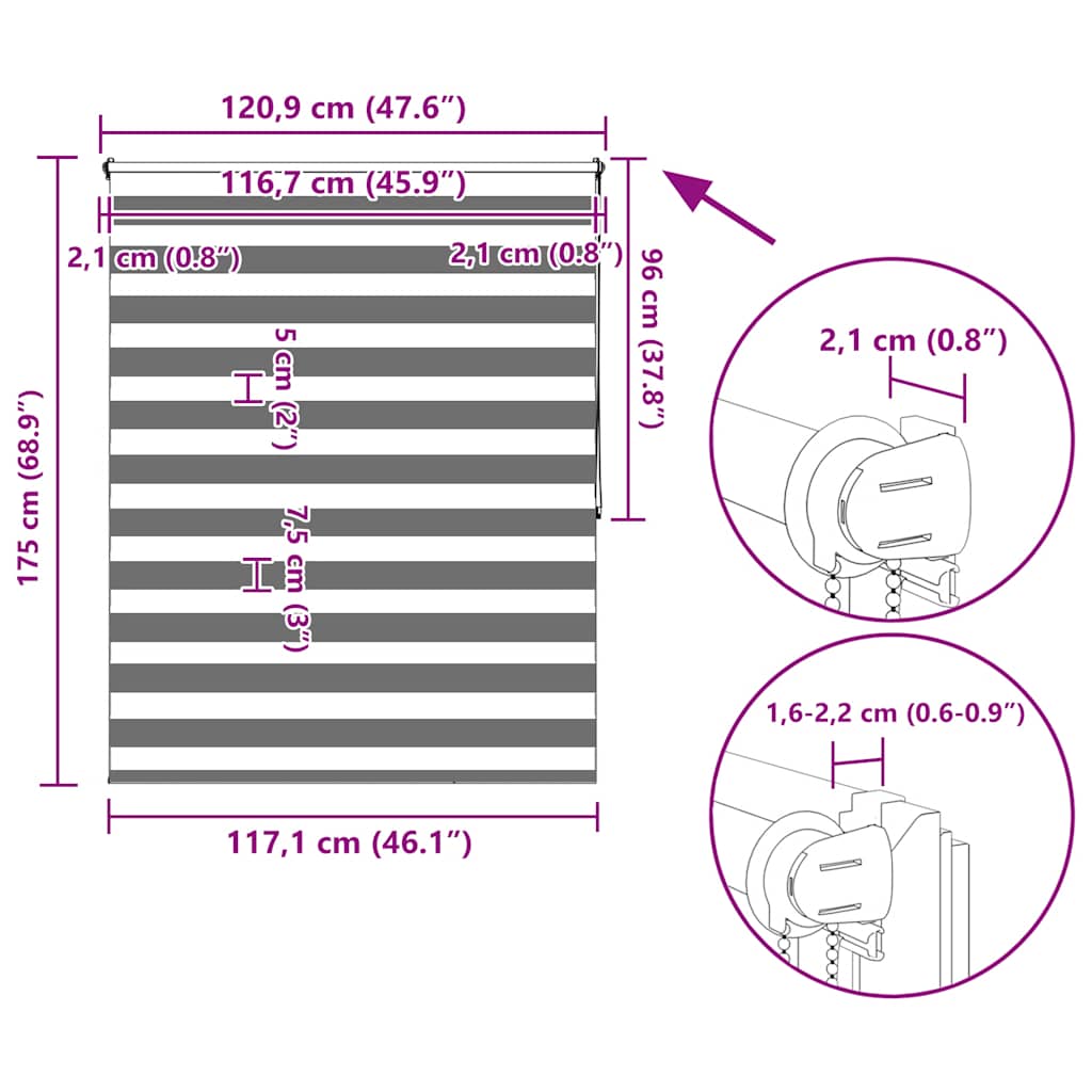 Ta elegantni rolo (senčilo) je odlična izbira za moderno stanovanje, saj ponuja stilsko alternativo za tradicionalne žaluzije ali zavese. Senčilo je sestavljeno iz dveh zaporednih rolojev, ki sta izdelana iz transparentnega blaga. S poljubno namestitvijo sprednjega in zadnjega roloja lahko preprosto dosežete želeni stil ter hitro spreminjate vzdušje v sobi tako, da se bo kar najbolj ujemalo s sodobno zasnovo prostora. Rolo je izdelan iz 100% poliestra. Poleg je priložena tudi bela vrvica, s katero lahko preprosto namestite in upravljate senčilo. Širina zgornjega prečnega droga s priloženimi pripomočki za namestitev bo 3 cm širša od širine senčila. Pošiljka vključuje 1 x 120 cm aluminijasti prečni drog s 117 x 175 cm zebra blagom, 1 x 120 cm prečni drog, 1 x 120 cm spodnji prečni drog, 2 x kavelj, 2 x nosilec, 1 x nosilec vrvice, 2 x vmesno podlogo in 1 x vrvico. GPSR