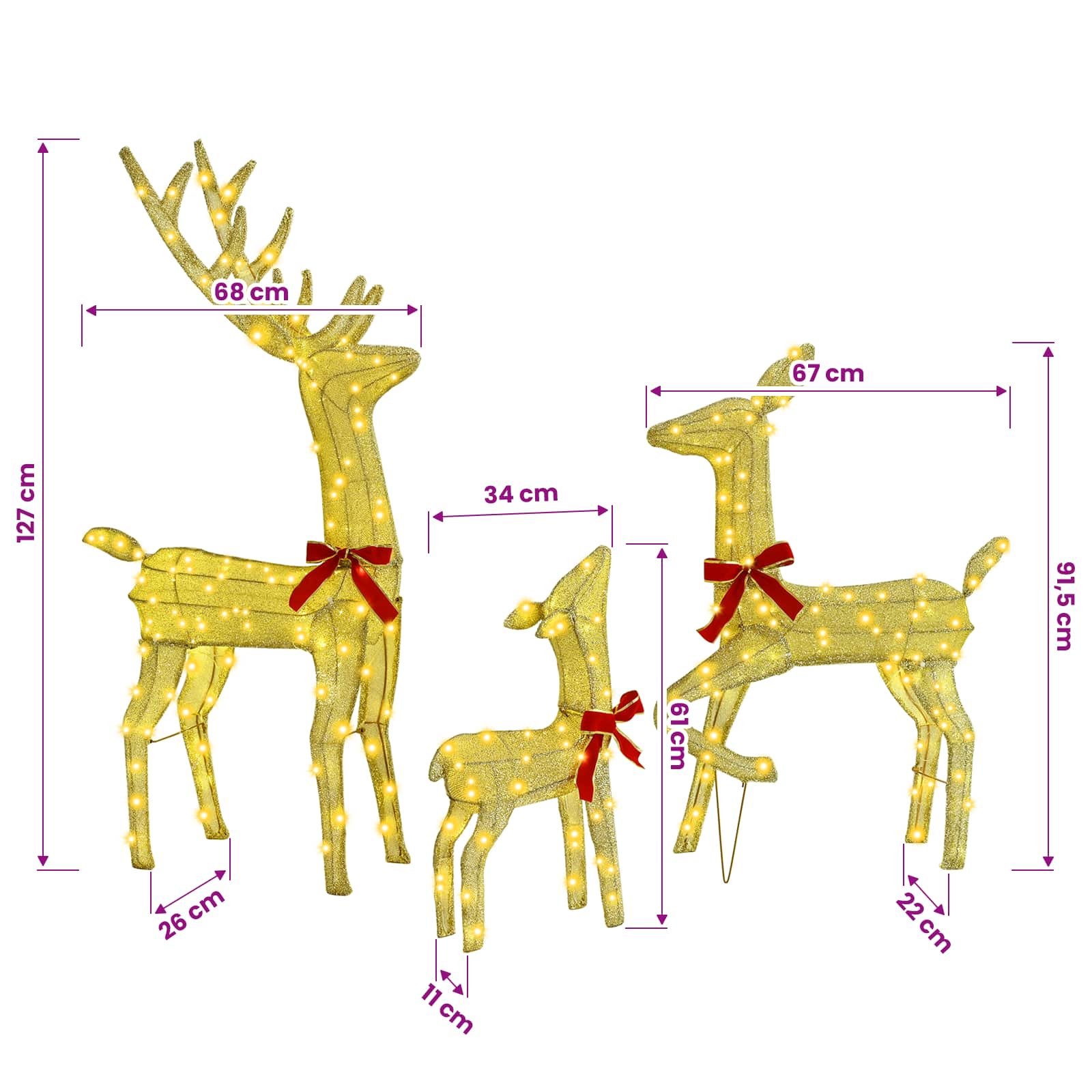 Ta fantastična praznična dekoracija Morden družine jelenčkov prinaša veselje in moderni stil s svojimi čistimi linijami in preprostimi okrasitvami. Super je za dnevno sobo in zunanje prostore pod streho ter vključuje očarljive figure s praznično tematiko, ki dodajo kanček igrivosti in topline vsakemu prazničnemu razpoloženju. Pomislite na te srčkane jelenčke, kako ponosno stojijo v vašem vrtu ali osvetljujejo vaš božični ambient, njihove LED luči oddajajo mehak sijaj, ki očara vsakogar. Z rdečimi mašnicami dodajajo praznično noto, zaradi česar so super dodatek vašemu sezonskemu dekorju. Kvalitetna tkanina Izdelane iz trpežnih materialov, ki prenesejo praznično obrabo. Tkanina je mehka na otip in hkrati robustna. Super za ustvarjanje prijetnega vzdušja, to zagotavlja dolgotrajne vizualne užitke v različnih prazničnih nastavitvah. Intrikatne LED luči Ti jelenčki so opremljeni z varčnimi LED lučmi, ki ponujajo osupljivo osvetlitev. Imajo osmih načinov utripanja, kar omogoča prilagoditev razpoloženja, bodisi praznične živahnosti bodisi subtilne zimske čarovnije. Pametno postavljene, LED luči ustvarjajo ljubek vizualni učinek, ki pritegne pogled in izboljša praznična doživetja. Uporabniku prijazna USB povezava: Napajanje preko USB-ja olajša nastavitev in omogoča fleksibilne možnosti brez iskanja električnih vtičnic. Ta učinkovit sistem napajanja je idealen za sodobne postavitve, kjer sta enostavnost in prilagodljivost na prvem mestu, kar zagotavlja nemoten prikaz vsako sezono. Sodobno stilno oblikovanje Ta družina jelenčkov prinaša sodoben videz s čistimi linijami in minimalnimi okrasitvami. Te figure se lepo prilagajajo različnim stilom dekoracije, kar ponuja mešanico čara in elegance. Njihova zasnova jih dela popolne za dodatek raznolikim prazničnim aranžmajem. Sezonska vsestranskost Primerni so tako za notranje prostore kot zunanje, zahvaljujoč vremensko odpornim lastnostim. Ti jelenčki prinašajo praznično razveselje v vsak prostor, ne glede na to, ali so ob kaminu ali zunaj v vrtu. Njihova prilagodljivost izboljšuje učinek prazničnega dekorja v domovih in okrajih. Ta izdelek se napaja z DC 5 V, vendar certificirani 5 V vir napajanja USB ni priložen. Višja napetost lahko povzroči pregrevanje in poškoduje napravo ter povzroči potencialno nevarnost pregrevanja in požara.