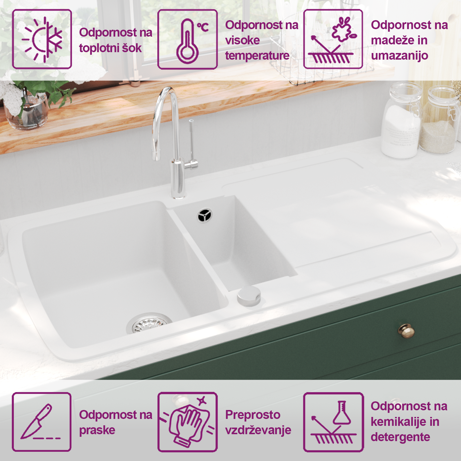 Naše granitno kuhinjsko pomivalno korito, ki je prijazno za uporabnika, bo hkrati brezčasno dopolnilo vaš kuhinjski dekor. Ima dvojna, zelo globoka korita in elegantno obliko. Visokokakovosten granit zagotavlja izjemno odpornost na toploto, praske in udarce kuhinjskega pomivalnega korita kakor tudi enostavno čiščenje. Je tudi popolnoma reverzibilno, zato se lahko korito namesti tako na desno kot tudi na levo stran. Priloženo je tudi sito za enostavno odstranjevanje odpadkov. Pomivalno korito je preprosto za namestitev.