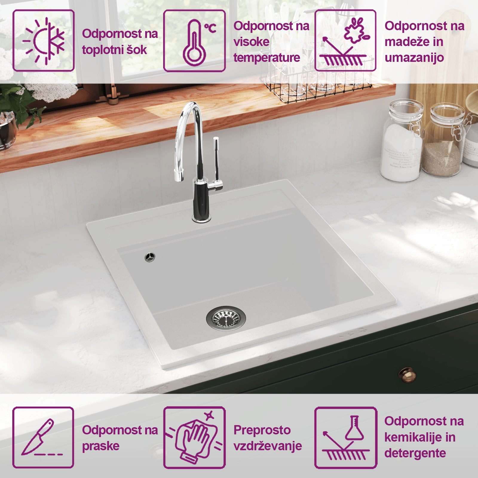 Naše granitno kuhinjsko pomivalno korito, ki je prijazno za uporabnika, bo hkrati brezčasno dopolnilo vaš kuhinjski dekor. Ima enojno, zelo globoko korito in elegantno obliko. Visokokakovosten granit zagotavlja izjemno odpornost na toploto, praske in udarce kuhinjskega pomivalnega korita kakor tudi enostavno čiščenje. Prav tako je priloženo tudi sito za enostavno odstranjevanje odpadkov. Pomivalno korito je preprosto za namestitev.Vtič ni priložen.