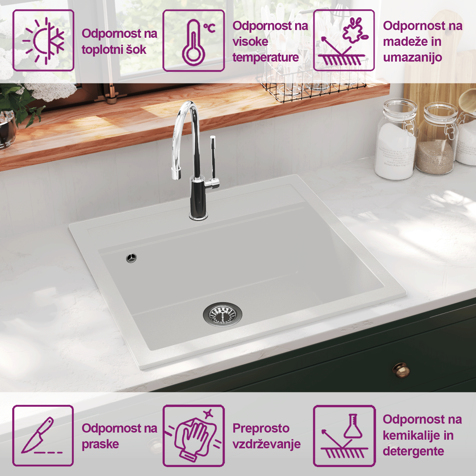 Naše granitno kuhinjsko pomivalno korito, ki je prijazno za uporabnika, bo hkrati brezčasno dopolnilo vaš kuhinjski dekor. Ima enojno, zelo globoko korito in elegantno obliko. Visokokakovosten granit zagotavlja izjemno odpornost na toploto, praske in udarce kuhinjskega pomivalnega korita kakor tudi enostavno čiščenje. Prav tako je priloženo tudi sito za enostavno odstranjevanje odpadkov. Pomivalno korito je preprosto za namestitev.