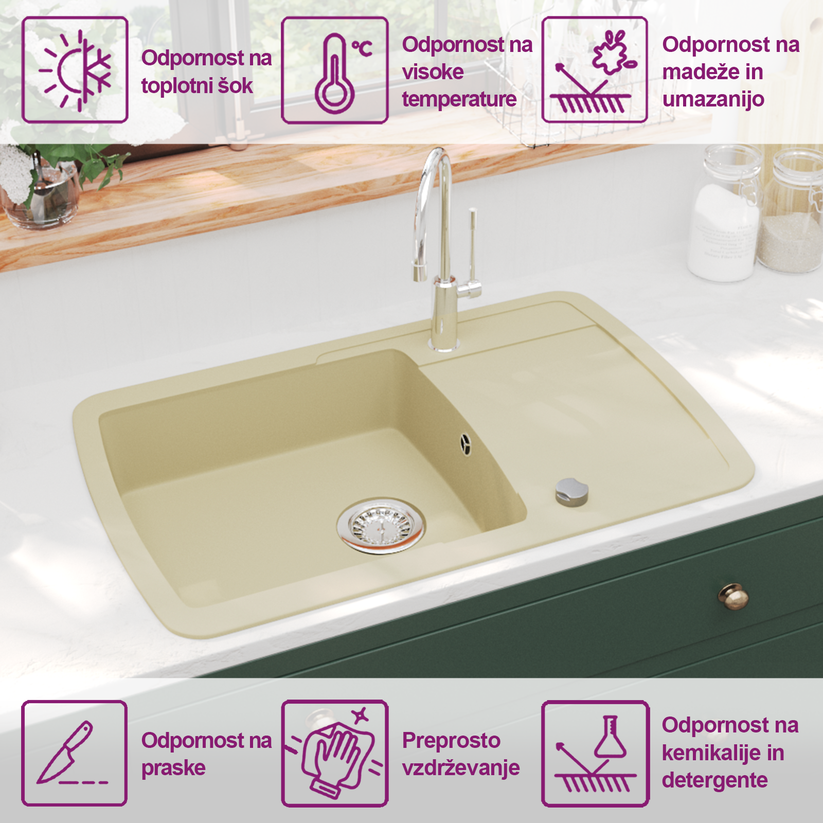 Naše granitno kuhinjsko pomivalno korito, ki je prijazno za uporabnika, bo hkrati brezčasno dopolnilo vaš kuhinjski dekor. Ima enojno, zelo globoko korito in elegantno obliko. Visokokakovosten granit zagotavlja izjemno odpornost na toploto, praske in udarce kuhinjskega pomivalnega korita kakor tudi enostavno čiščenje. Je tudi popolnoma reverzibilno, zato se lahko korito namesti tako na desno kot tudi na levo stran. Priloženo je tudi sito za enostavno odstranjevanje odpadkov. Pomivalno korito je preprosto za namestitev.
