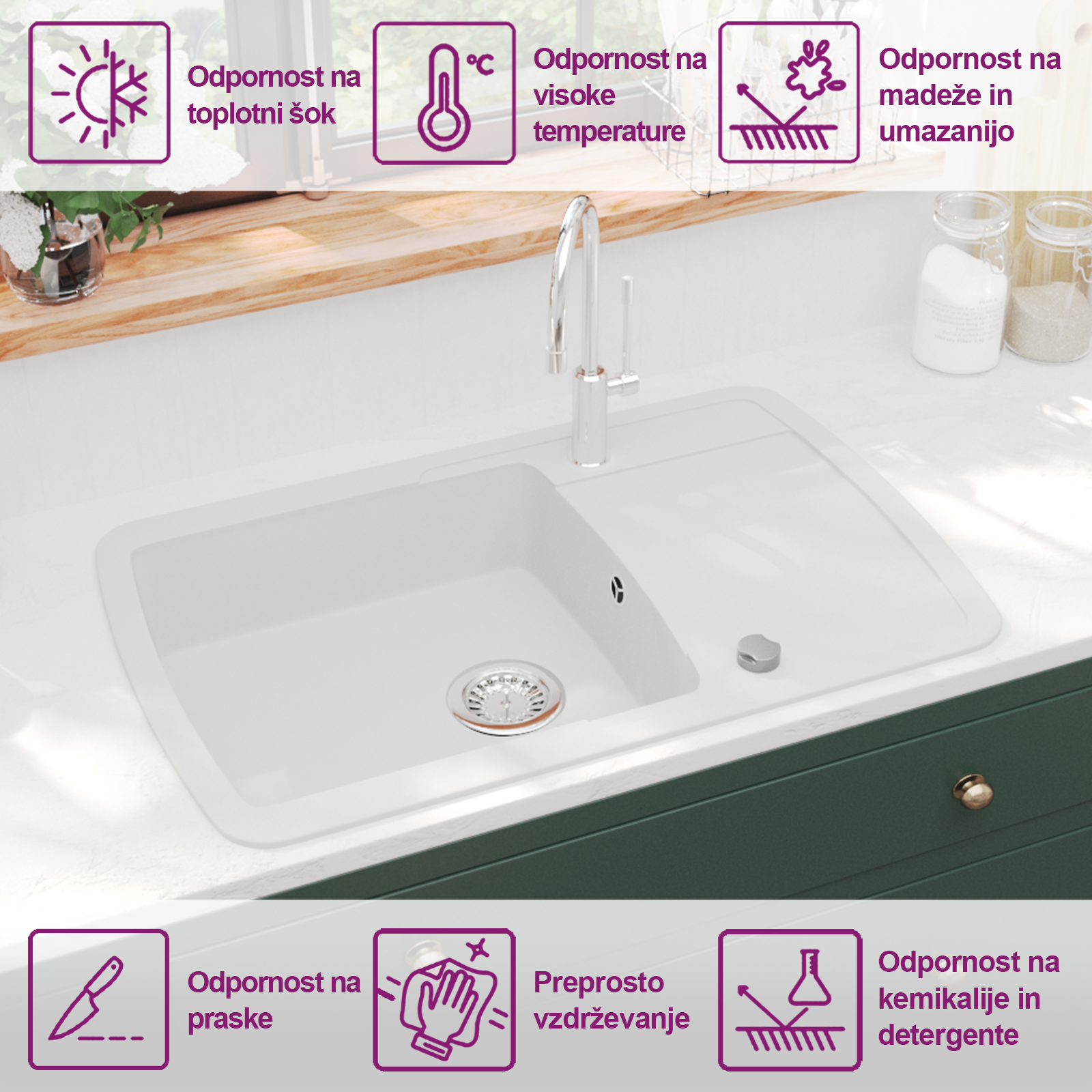 Naše granitno kuhinjsko pomivalno korito, ki je prijazno za uporabnika, bo hkrati brezčasno dopolnilo vaš kuhinjski dekor. Ima enojno, zelo globoko korito in elegantno obliko. Visokokakovosten granit zagotavlja izjemno odpornost na toploto, praske in udarce kuhinjskega pomivalnega korita kakor tudi enostavno čiščenje. Je tudi popolnoma reverzibilno, zato se lahko korito namesti tako na desno kot tudi na levo stran. Priloženo je tudi sito za enostavno odstranjevanje odpadkov. Pomivalno korito je preprosto za namestitev.