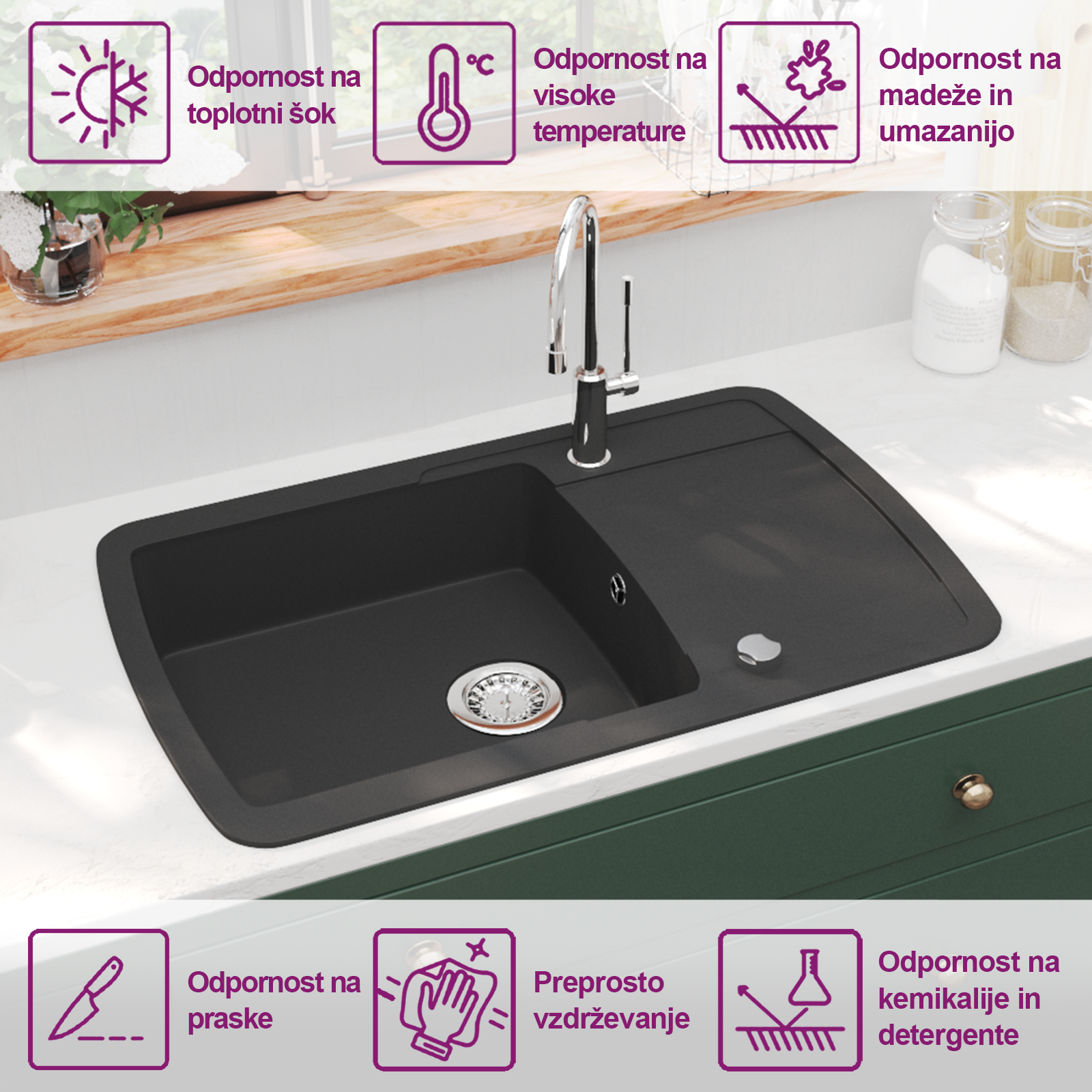 Naše granitno pomivalno korito bo brezčasen dodatek, ki se bo podal k dekorju v vaši kuhinji. Ima enojno in izjemno globoko korito ter eleganten dizajn. Visokokakovosten uporabljeni granit zagotavlja, da je pomivalno korito odporno na vročino, praske in udarce ter preprosto za čiščenje. Je popolnoma reverzibilno, zato se lahko korito namesti na levo ali desno stran. Priloženo je tudi cedilo za preprosto odstranjevanje umazanije. Pomivalno korito je preprosto za montažo.