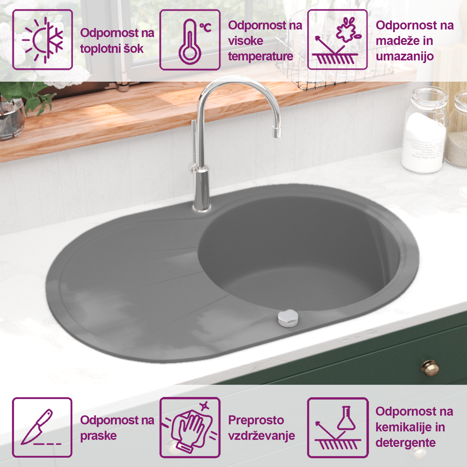 Naše granitno pomivalno korito bo brezčasen dodatek, ki se bo podal k dekorju v vaši kuhinji. Ima enojno in izjemno globoko korito ter eleganten dizajn. Visokokakovosten uporabljeni granit zagotavlja, da je pomivalno korito odporno na vročino, praske in udarce ter preprosto za čiščenje. Je popolnoma reverzibilno, zato se lahko korito namesti na levo ali desno stran. Priloženo je tudi cedilo za preprosto odstranjevanje umazanije. Pomivalno korito je preprosto za montažo.