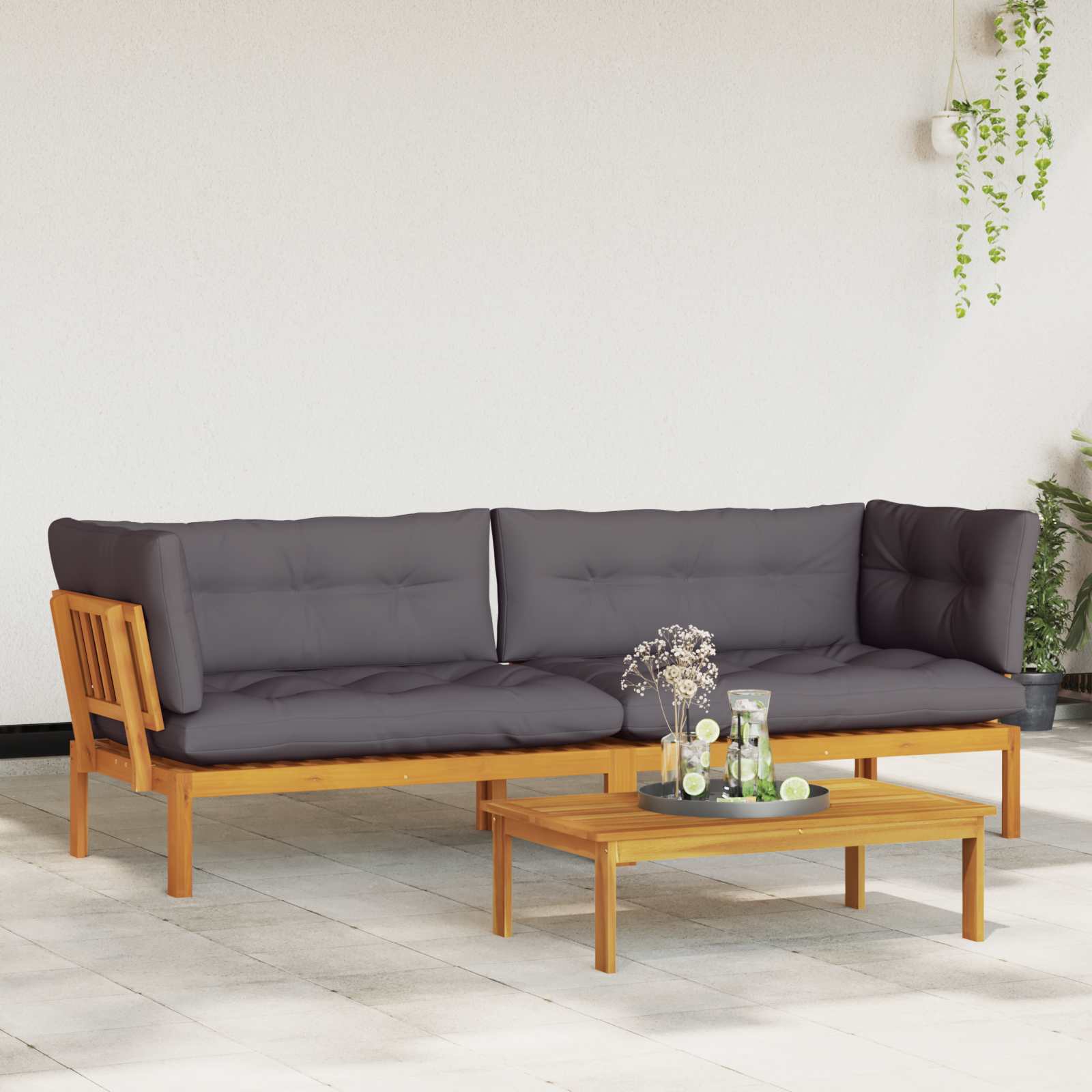 Ta rustikalni vrtni kavč iz palet je oblikovan za udobno sedenje na prostem, z naravnim videzom, ki pritegne pogled. Narejen iz trdnega akacijevega lesa, okvir pokaže tople odtenke in značilne vzorce lesa, ki se odlično ujemajo z vrtnarskimi, patio ali terasnimi prostori. Kotna zasnova ustvarja sproščen prostor za druženje, medtem ko priložena nizka miza ponuja priročno mesto za pijače ali manjše predmete. Blazine iz penastega materiala in rahlo nagnjeno naslonjalo zagotavljajo udobno sedenje za vsakodnevno sprostitev zunaj. Trdna konstrukcija iz akacijevega lesa Okvir, naslonjalo, noge in površina so izdelani iz trdnega akacijevega lesa, znanega po svoji naravni odpornosti in značilni teksturi. Ta les daje prijeten, vroč videz in zagotavlja stabilno strukturo za zunanjo uporabo. Fiksna mrežasta zasnova Zasnova z nefleksibilnimi letvami nudi trdno podporo za udobno sedenje in je primerna za redno uporabo na prostem. Vremensko odporne lastnosti Kavč je zasnovan za zunanje okolje in pomaga ohraniti svoj videz ter strukturo skozi vse letne čase. Primerno je za rabo v sončnih ali deževnih dneh, kar omogoča dolgoročno uporabo na prostem. Kotna lounge postavitev s priloženo mizo Njegova kotna zasnova optimizira zunanji prostor in hkrati ustvari sproščen lounge prostor. Nizka miza je vključena, da omogoči priročno površino za pijače, prigrizke ali dekoracijo. Enostavna vzdrževanje Le obrišite kavč z vlažno krpo, da ohranite njegov videz pri vsakodnevni rabi. Minimalna potreba po vzdrževanju omogoča, da bo idealen za redno uporabo na prostem.