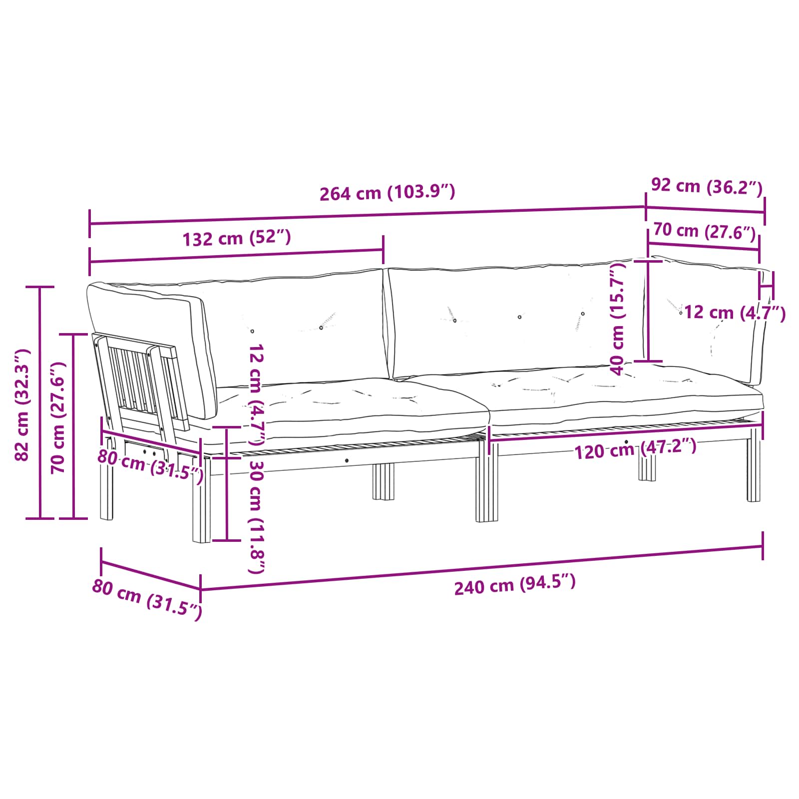 - 2 x Zadnji vzglavnik: 120 x 40 x 12 cm (D x Š x V)