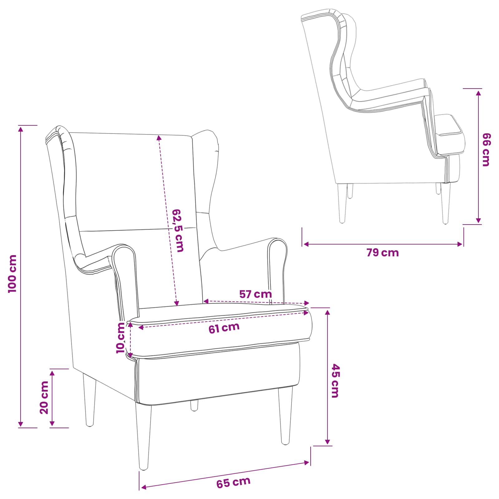 - Splošne dimenzije: 65 x 79 x 100 cm (D x Š x V)