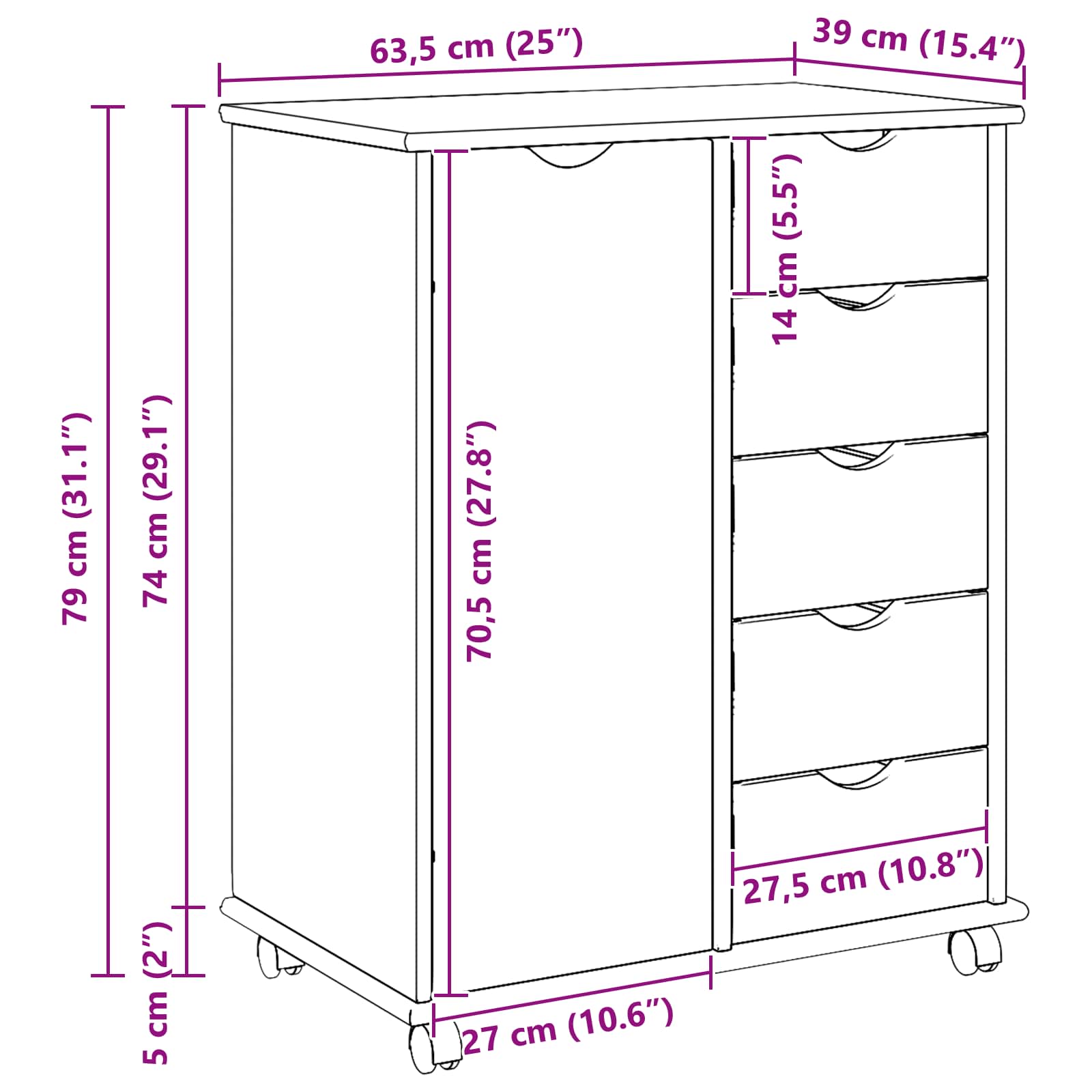 - 1 x Rolling cabinet: 63,5 x 39 x 74 cm (Š x G x V)