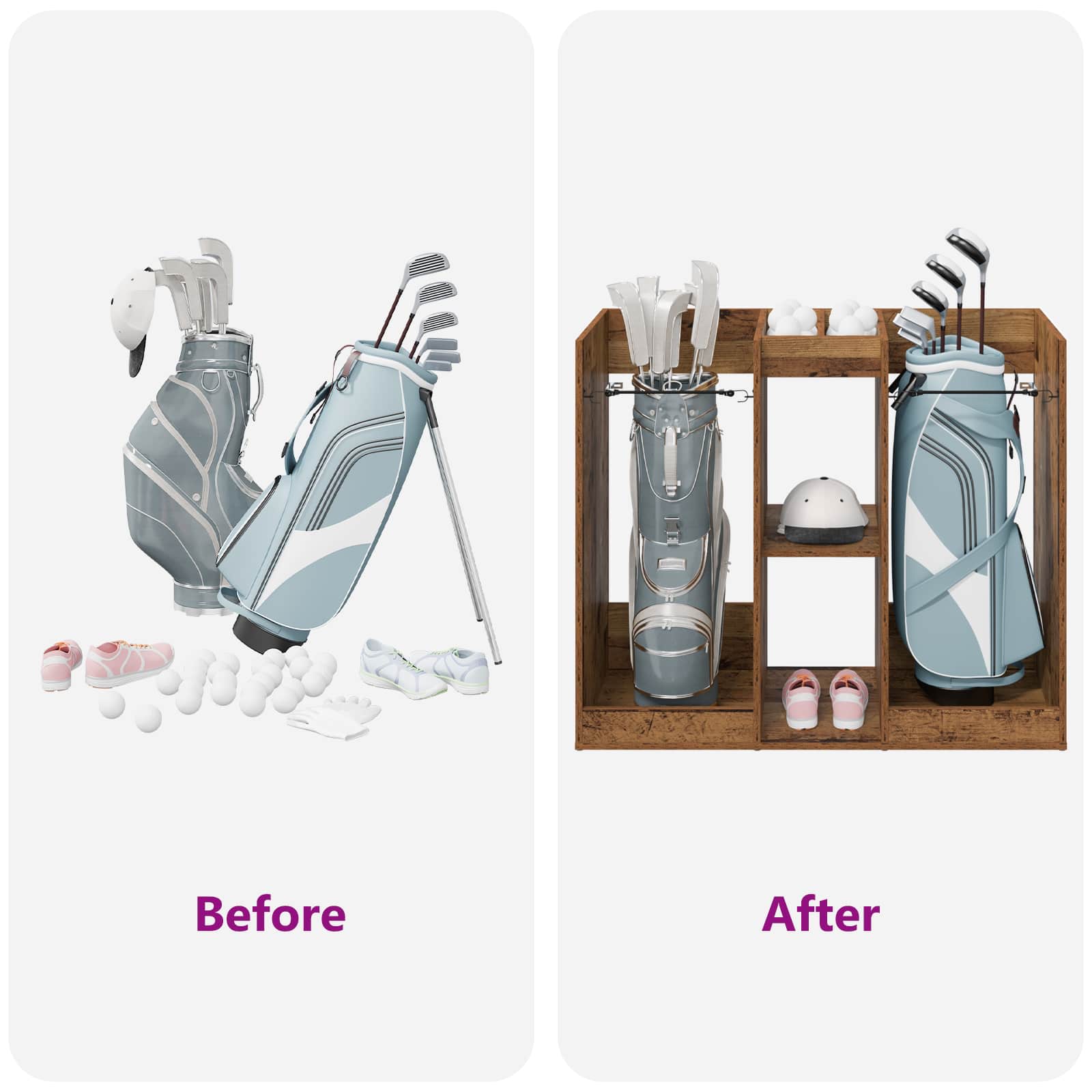 Ta omarica za golf je odlična izbira, če iščete prostorno shranjevanje z modernim stilom. Zasnovana je za notranjo rabo, doda pridih elegance vsaki garaži ali sobi. Z enostavno pravokotno obliko in gladko površino prinaša nekakšno poenostavljeno estetiko. Odlično shranjuje vaše osnovne golf potrebščine in ohranja urejenost, saj povezuje stil in funkcionalnost. Materiali: Natančno izdelana iz lesa, ta omara je močna in elegantna rešitev za shranjevanje. Naravni les prinaša toplino in trdnost v vaš notranji prostor, material je trpežen in dolgotrajen ter izboljšuje videz enote. Vključeni deli: Prostostoječe police iz lesa zagotavljajo zanesljivo podporo vašim stvarem. Kovinska hrbtna stran daje končni, estetski pridih, ki dopolnjuje prostor. Praškasto prevlečen kovinski okvir povečuje odpornost omare in zagotavlja trdnost. Značilnosti: Z oblikovanjem številnih shranjevalnih možnosti je idealna za organizacijo golf dodatkov in še več. Neprosojna zasnova skrbno skriva vsebino, njen moden stil pa se prilega različnim domačim dekorjem. Je praktična pomoč za ohranjanje reda in dodaja kanček elegance. Priporočene uporabe: Odlična je za garaže ali notranje prostore, kjer potrebujete več prostora za shranjevanje. Ne glede na to, ali gre za golf opremo ali druge predmete, se zlahka prilega v prostore s sodobnim občutkom. Njena uporabnost presega šport in pokriva številne potrebe po shranjevanju. Osnovna nega: Za ohranjanje lepote redno brišite površino z mehko krpo. Izogibajte se ostrim kemikalijam, da les ohrani svoj naravni sijaj. Minimalno vzdrževanje zagotavlja stiliziran videz omare skozi čas.