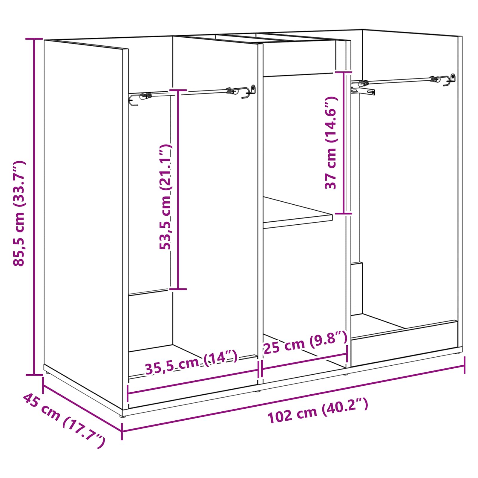 - Splošne dimenzije: 102 x 45 x 85,5 cm (D x Š x V)
