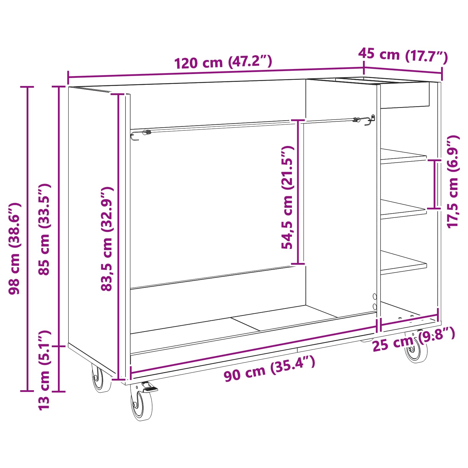 - Splošne dimenzije: 120 x 45 x 98 cm (D x Š x V)