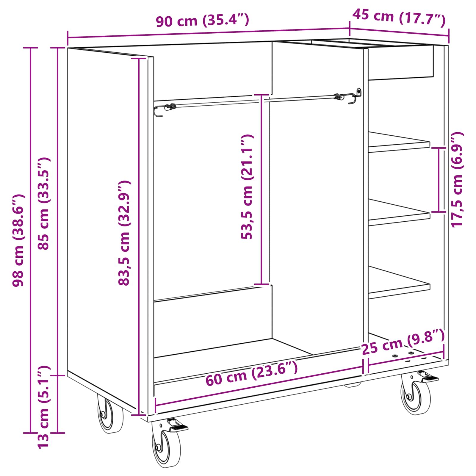 - Splošne dimenzije: 90 x 45 x 98 cm (D x Š x V)