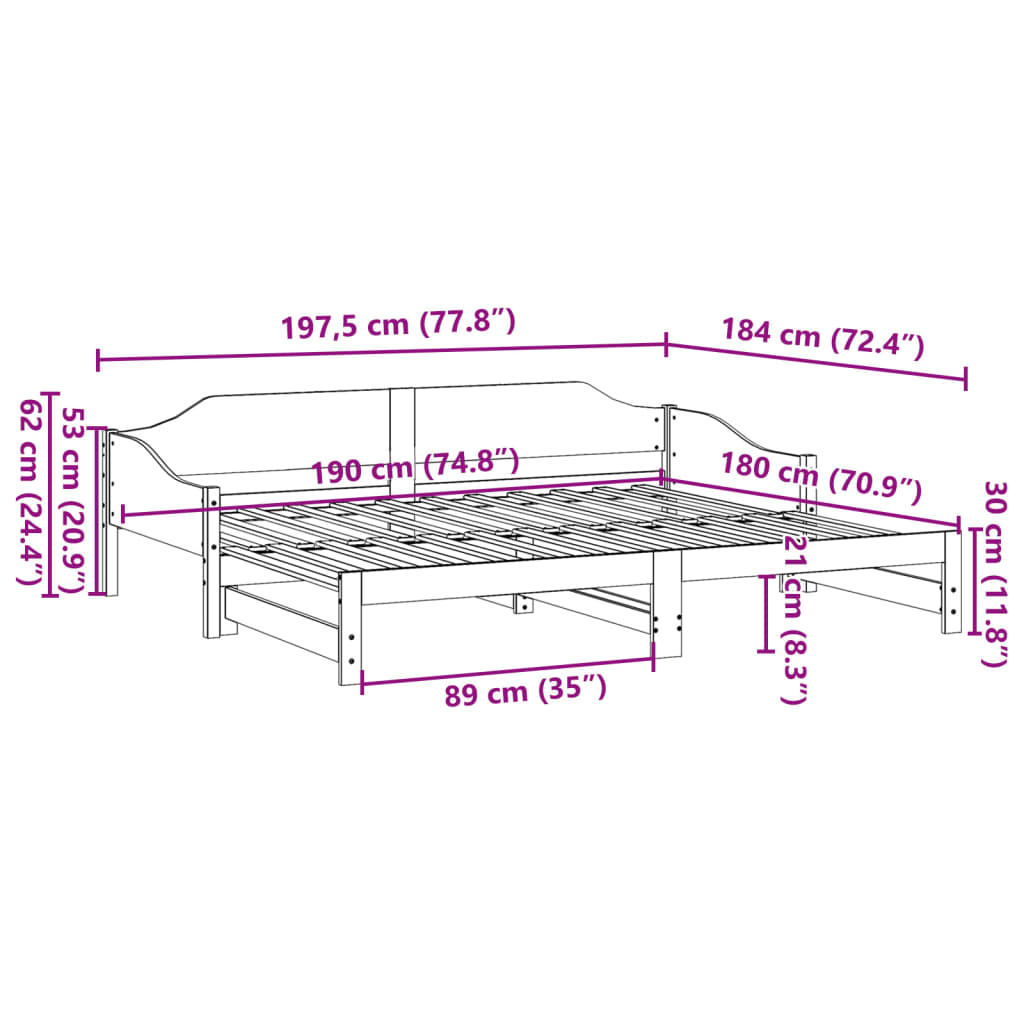 Ta 2 v 1 izvlečna dnevna postelja, ki služi kot kavč in postelja, je praktičen in privlačen dodatek za vašo dnevno sobo ali spalnico. Stabilen in dolgotrajen okvir: Trdna borovina je znana po svoji trdnosti in trajnosti. Ravni vzorci in značilni vozli prispevajo k njenemu rustikalnemu čaru.Letvice za optimalno podporo: Postelja je opremljena z letvicami, ki zagotavljajo osnovno podporo in zračnost vašega ležišča.Vsestranska dnevna postelja: Raztegljiva postelja čez dan deluje kot kavč, ponoči pa se z izvlečenim ležiščem zlahka spremeni v zakonsko posteljo, kar je priročna rešitev za sprejemanje gostov in maksimalno povečanje prostora.Dodaten prostor za shranjevanje: Za večje udobje je pod posteljo dodaten prostor, v katerem lahko shranite škatle za shranjevanje, da bodo lepo skrite. Dobro je vedeti:Ta okvir postelje ima zasnovo z letvicami in vključuje letvice.Vzmetnice niso priložene tej postelji. Ponujamo različno izbiro ležišč. V naši trgovini si lahko ogledate ustrezne vzmetnice.