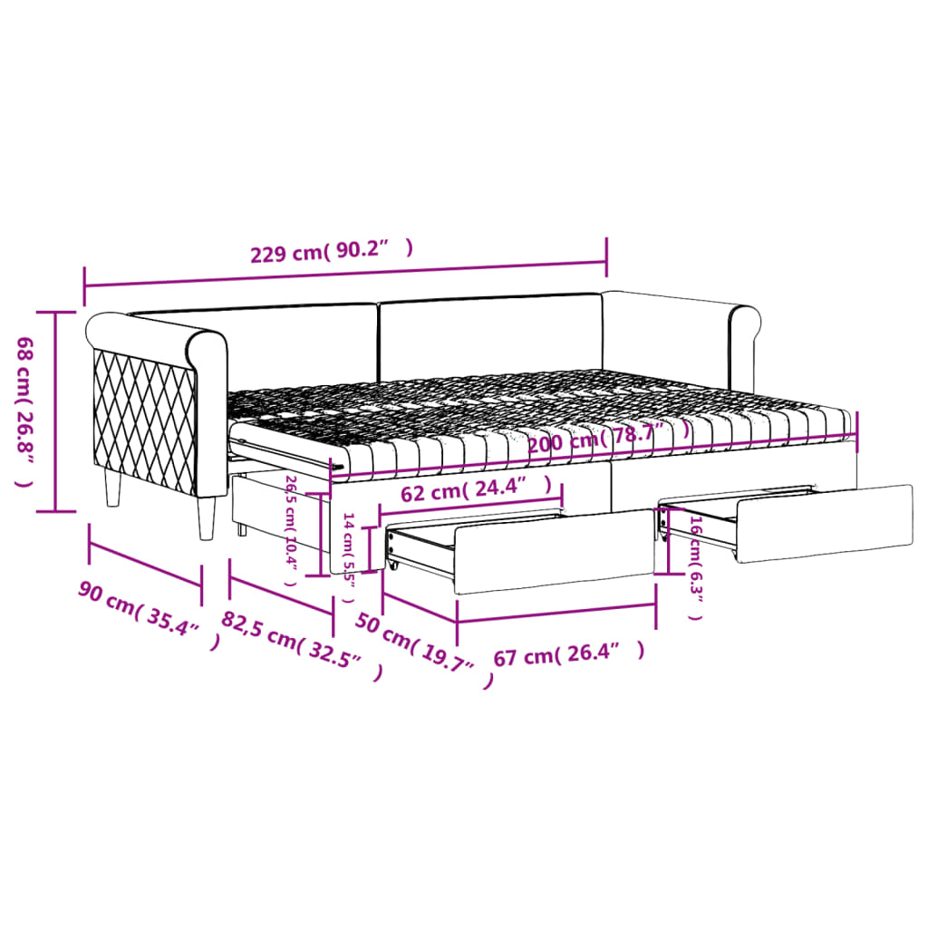 Ta 2-v-1 dnevna postelja z izvlečnim ležiščem, ki služi kot kavč in postelja, je praktičen in privlačen dodatek vaši dnevni sobi ali spalnici. Vsestranska dnevna postelja: Raztegljiva kavč čez dan služi kot kavč, ponoči pa se z izvlečnim izvlečnim ležiščem enostavno spremeni v zakonsko posteljo, kar zagotavlja priročno rešitev za sprejem gostov in maksimiranje prostora.Obilo prostora za shranjevanje: Ta postelja za goste ima dva predala s kolesi, ki zagotavljata dovolj prostora za shranjevanje oblačil, nogavic, igrač, blazin itd.Udobna vzmetnica iz pene: Ta postelja za spanje je dobavljena z dvema vzmetnicama iz pene za maksimalno oporo in optimalno udobje.Mehak žamet in trdna konstrukcija: Ta dnevna postelja ima trden okvir iz lesa in kovine ter je oblazinjena z mehkim in udobnim žametom. Dobro je vedeti:Ta posteljni okvir ima letvičasto dno in vključuje letvice.