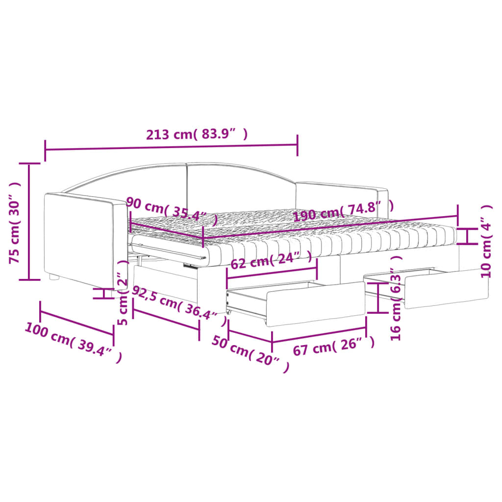 Ta 2-v-1 dnevna postelja z izvlečnim ležiščem, ki služi kot kavč in postelja, je praktičen in privlačen dodatek vaši dnevni sobi ali spalnici. Vsestranska dnevna postelja: Raztegljiva kavč čez dan služi kot kavč, ponoči pa se z izvlečnim izvlečnim ležiščem enostavno spremeni v zakonsko posteljo, kar zagotavlja priročno rešitev za sprejem gostov in maksimiranje prostora.Obilo prostora za shranjevanje: Ta postelja za goste ima dva predala s kolesi, ki zagotavljata dovolj prostora za shranjevanje oblačil, nogavic, igrač, blazin itd.Udobna vzmetnica iz pene: Ta postelja za spanje je dobavljena z dvema vzmetnicama iz pene za maksimalno oporo in optimalno udobje.Trpežna tkanina in trdna konstrukcija: Ta dnevna postelja ima trden okvir iz lesa in kovine ter je oblazinjena s trpežno in udobno tkanino. Dobro je vedeti:Ta posteljni okvir ima letvičasto dno in vključuje letvice.