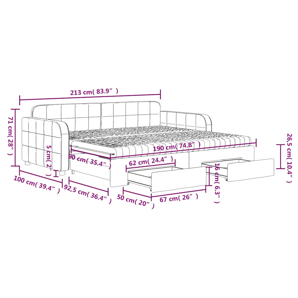 Ta 2 v 1 izvlečna dnevna postelja, ki služi kot kavč in postelja, je praktičen in privlačen dodatek za vašo dnevno sobo ali spalnico. Vsestranska dnevna postelja: Raztegljiva postelja čez dan deluje kot kavč, ponoči pa se z izvlečenim ležiščem zlahka spremeni v zakonsko posteljo, kar je priročna rešitev za sprejemanje gostov in maksimalno povečanje prostora.Veliko prostora za shranjevanje: Ta postelja za goste ima dva predala s kolesi, ki zagotavljata dovolj prostora za shranjevanje oblačil, nogavic, igrač, blazin itd.Udobna penasta vzmetnica: Ta postelja je opremljena z dvema vzmetnicama iz pene za največjo podporo in optimalno udobje.Mehak žamet in trdna konstrukcija: Ta dnevna postelja ima trpežen okvir iz lesa in kovine ter je oblazinjena z mehkim in udobnim žametom.