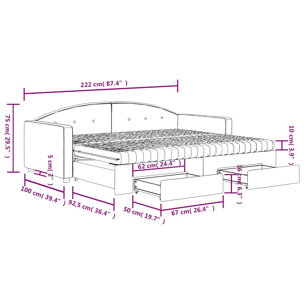 Ta dnevna postelja 2 v 1 z izvlečnim ležiščem in predali, ki služi kot kavč in postelja, je praktičen in privlačen dodatek k vaši dnevni sobi ali spalnici. Vsestranska dnevna postelja: Raztegljiv kavč čez dan služi kot kavč, ponoči pa se z izvlečnim izvlečnim ležiščem enostavno spremeni v zakonsko posteljo, kar zagotavlja priročno rešitev za sprejem gostov in maksimiranje prostora. Obilo prostora za shranjevanje: Ta postelja za goste ima dva predala s kolesi, ki zagotavljata dovolj prostora za shranjevanje oblačil, nogavic, igrač, blazin itd. Udobna vzmetnica iz pene: Ta postelja za spanje je dobavljena z dvema vzmetnicama iz pene za maksimalno oporo in optimalno udobje. Mehak žamet in trdna konstrukcija: Ta kavč z raztegljivim ležiščem ima trden okvir iz lesa in kovine ter je oblazinjen z mehkim in udobnim žametom. Dobro je vedeti:Ta posteljni okvir ima letvičasto dno in vključuje letvice.