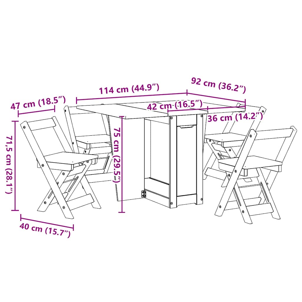 S to zložljivo jedilno garnituro lahko ustvarite prijeten in privlačen prostor za začetek dneva ali uživanje v skupnih obrokih. Trpežna in dolgotrajna: Ta jedilna garnitura je izdelana iz trpežne borovine in inženirskega lesa, kar zagotavlja stabilnost in trdnost za dolgotrajno uporabo.Raztegljiva in zložljiva: Miza ima zložljivo in raztegljivo sklopno mizno ploščo, ki po potrebi zagotavlja dodaten prostor in se zlahka zloži, ko je ne uporabljate. Prav tako so zložljivi tudi stoli, kar omogoča priročno shranjevanje in prevoz.Kompaktno shranjevanje in varčevanje s prostorom: Miza ima funkcijo shranjevanja, ki vam omogoča, da zložljive stole lepo shranite pod mizo in tako prihranite dragoceni prostor, ko niso v uporabi.Vsestranska uporaba: Ta miza je s svojo sodobno obliko s sklopno mizno ploščo hkrati jedilna miza in priročen delovni prostor za računalnik, pa tudi očarljiva miza za zajtrk. Zaradi svoje vsestranskosti je odličen dodatek za vsak prostor.Enostavno vzdrževanje: Zaradi gladke površine je jedilno garnituro enostavno očistiti z vlažno krpo, saj ne potrebuje veliko vzdrževanja.