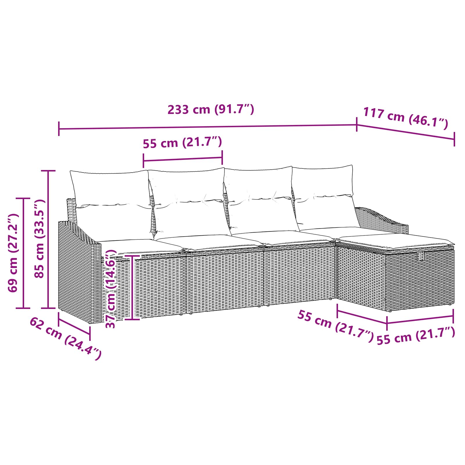 - 2 x naslonjalo: 55 x 62 x 69 cm (D x Š x V)