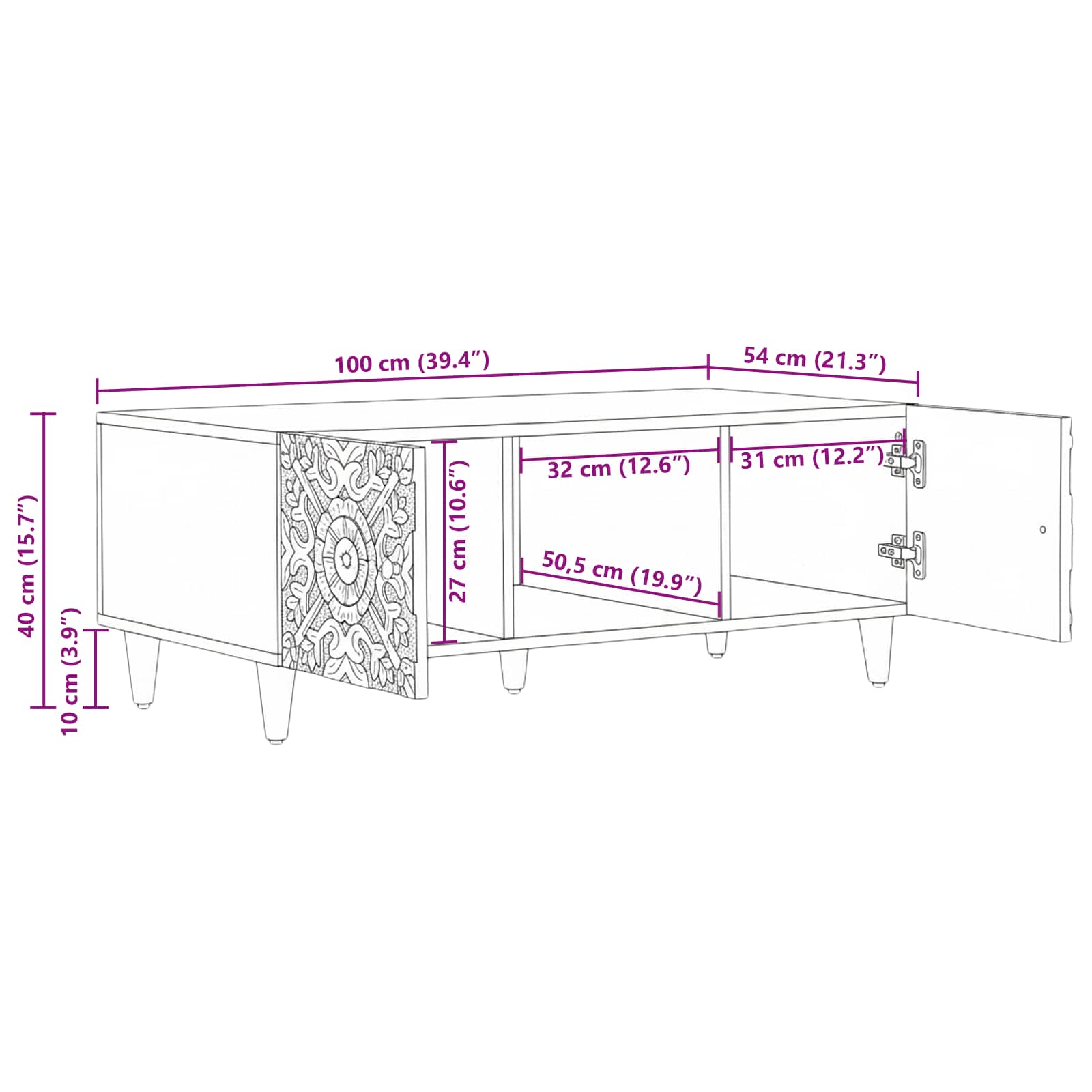 - Splošne dimenzije: 100 x 54 x 40 cm (D x Š x V)