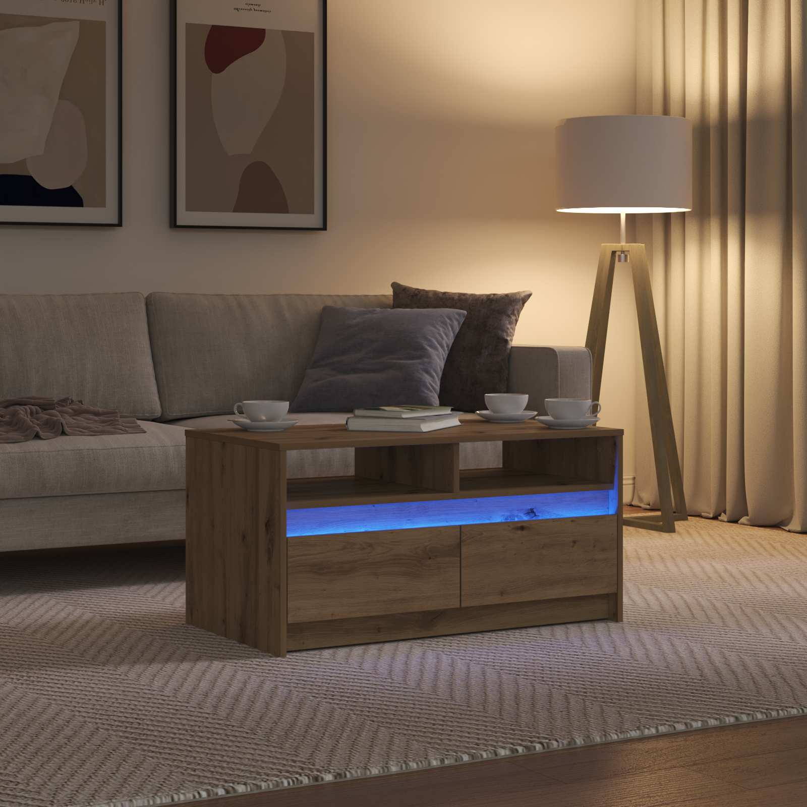 Ta moderna kavna mizica ima elegantno pravokotno obliko, ki se odlično poda sodobnim dnevnim sobam. Z lepim šarmom ni le funkcionalna površina, ampak daje tudi eleganten pridih vaši dekoraciji. Osvetlitvena funkcija oddaja topel sijaj, kar ustvarja prijetno vzdušje za intimna srečanja in vsakodnevno rabo, okvir iz inženirskega lesa pa zagotavlja trajnost in zanesljivost. LED akcentna osvetlitev Viltrak s prilagodljivimi LED lučmi ponuja ambientno svetlobo, ki popestri vaš prostor. Osvetlitev izpostavi posebne dekorativne elemente ali arhitekturne značilnosti, dodaja globino in vizualno zanimivost sobi. Trajna konstrukcija iz inženirskega lesa Mizica je zasnovana iz inženirskega lesa, kar ji daje močan in fleksibilen izgled. Material prenese vsakodnevne obremenitve in obdrži svoj eleganten videz, kar je pametna dolgoročna naložba. Funkcionalen shranjevalni predal Gladen predal iz inženirskega lesa nudi dovolj prostora za revije, daljinske upravljalnike in druge drobnarije, kar pomaga ohranjati prostor organiziran. Pravokotna oblika Dimenzije 90 x 50 cm zagotavljajo dovolj površine za prikaz in uporabo, idealne za sprejem gostov ali uživanje v prostem času. Njena nizka zasnova je primerna za dnevne sobe, kar omogoča enostavno prilagoditev. Enostavno vzdrževanje Zaželeno je, da jo čistite z suho krpo in se izogibate močnim kemikalijam ali abrazivom. Preprosta rutina vzdrževanja ji daje živahen izgled in ohranja njeno središče v vašem domu. Uporabljajte samo certificiran enosmerni vhod 5 V. Višja napetost lahko povzroči pregrevanje in poškodbe naprave ter morebitno tveganje pregrevanja in požara. Izdelka ne priključujte na noben drug vir napajanja, razen tistega, ki je opisan v priročniku, na tipski ploščici ali ga posebej priporoča vidaXL. Te naprave ne smejo uporabljati otroci, mlajši od 14 let, in osebe z zmanjšanimi telesnimi, senzoričnimi ali duševnimi sposobnostmi ali s pomanjkanjem izkušenj in znanja o uporabi elektronskih naprav. Elektrika je nevarna. Poškodbe in nepravilna namestitev, uporaba ali spreminjanje (zamenjava posameznih komponent) lahko povzročijo poškodbe enote, kar povzroči električni udar in nevarnost za uporabnika. Izdelka ne uporabljajte v eksplozivnih okoljih, na primer v prisotnosti vnetljivih tekočin, plinov in prahu ali nad 50 stopinj Celzija ali več. Izdelka ne vklapljajte, če sta priključni kabel ali napajalnik vidno poškodovana. Če je zunanji fleksibilni kabel ali vrvica te svetilke poškodovana, jo mora zamenjati izključno proizvajalec ali njegov serviser ali podobno usposobljena oseba, da se izognete nevarnosti. Med namestitvijo in vzdrževanjem izklopite napajanje. Prepričajte se, da so se žarnice ohladile. Svetlobnega vira te svetilke ni mogoče zamenjati; ko svetlobni vir doseže konec svoje življenjske dobe, je treba zamenjati celotno svetilko. Samo za notranjo uporabo, tega izdelka ne uporabljajte na prostem. Izdelek ima priključek USB, vendar certificiran 5V vir napajanja USB ni priložen.
