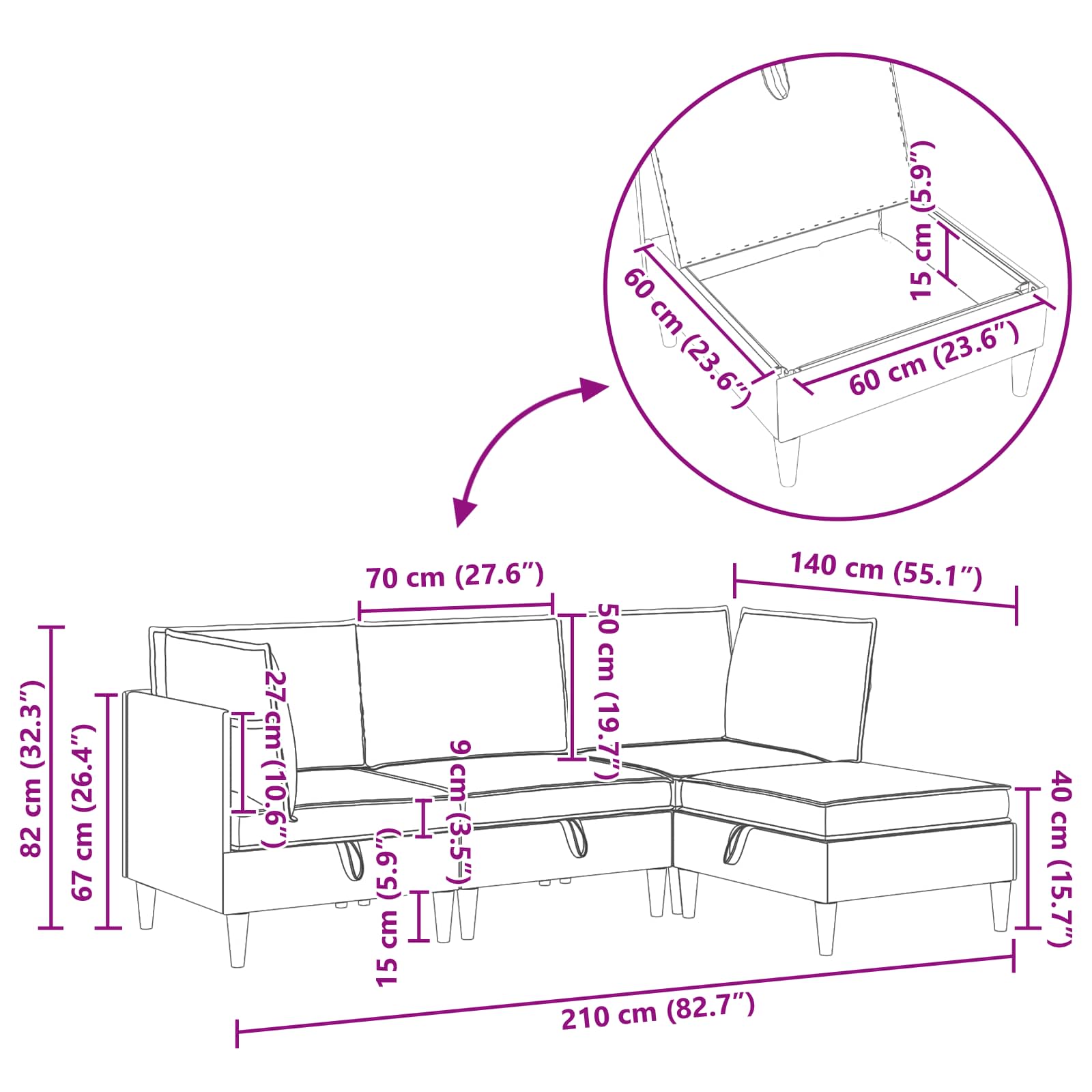 - 2 x Kotna kavč: 70 x 70 x 82 cm (Š x G x V)
