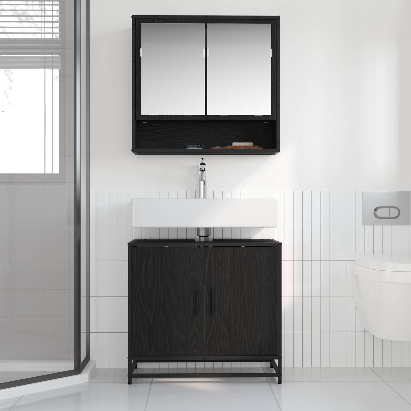Predstavljamo moderni set kopalniškega pohištva, ki združuje stil in funkcionalnost za vsakodnevno uporabo. S svojimi čistimi linijami in gladkim zaključkom iz inženirskega lesa je idealen za vsako kopalnico. Zasnovan za tiste, ki cenijo sodobno estetiko, ta set omogoča enostaven dostop do potrebščin, ne da bi žrtvoval eleganco. Zagotavlja mirno in urejeno izkušnjo, ki pritegne k modernemu oblikovanju. Materiali: Set je izdelan iz inženirskega lesa, znanega po vzdržljivosti in gladkem zaključku, kar daje prostoru pridih sofisticiranosti in dolga leta uporabe. Ta material združuje estetiko in praktičnost, idealen za kopalniško pohištvo. Odpornost proti vlagi podaljšuje njegovo življenjsko dobo. Vključene komponente: Set vsebuje stensko omarico z ogledalom in omarico pod umivalnikom, ki omogoča enostavno nego in nudi dovolj shranjevanja za vsakodnevne potrebščine. Zasnova z flush vrati in črnimi palicami za ročaje doda sodoben pridih, kar povečuje funkcionalnost in estetiko. Lastnosti / Funkcija / Oblikovanje: Oblika se drži moderne preprostosti, z ravnimi črtami in minimalnim okrasjem. Ta set nudi širok prostor za shranjevanje brez žrtvovanja sloga. Oblikovan je tako, da ustreza potrebam sodobnega gospodinjstva in ohranja urejen videz. Priporočene uporabe: Popoln za sodobne kopalnice, ta set ponuja odlične rešitve za organizacijo toaletnih in lepotnih potrebščin. Odlično se ujema z odraslimi, ki cenijo organizirano in estetsko urejeno okolje. Vzdrževanje in oskrba: Ta set zahteva minimalno vzdrževanje. Preprosto obrišite z vlažno krpo, da odstranite prah in madeže. Ta preprosta rutina ohranja vaš set videti sveže in prijetno ter povečuje njegovo vzdržljivost.