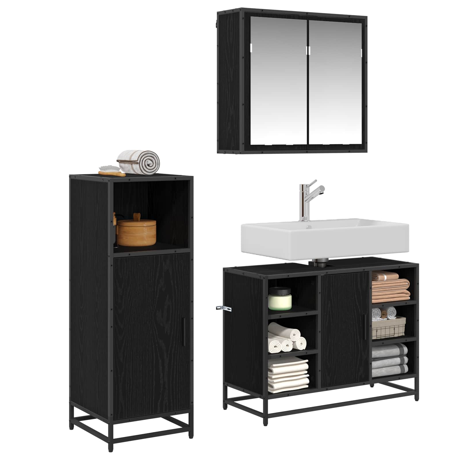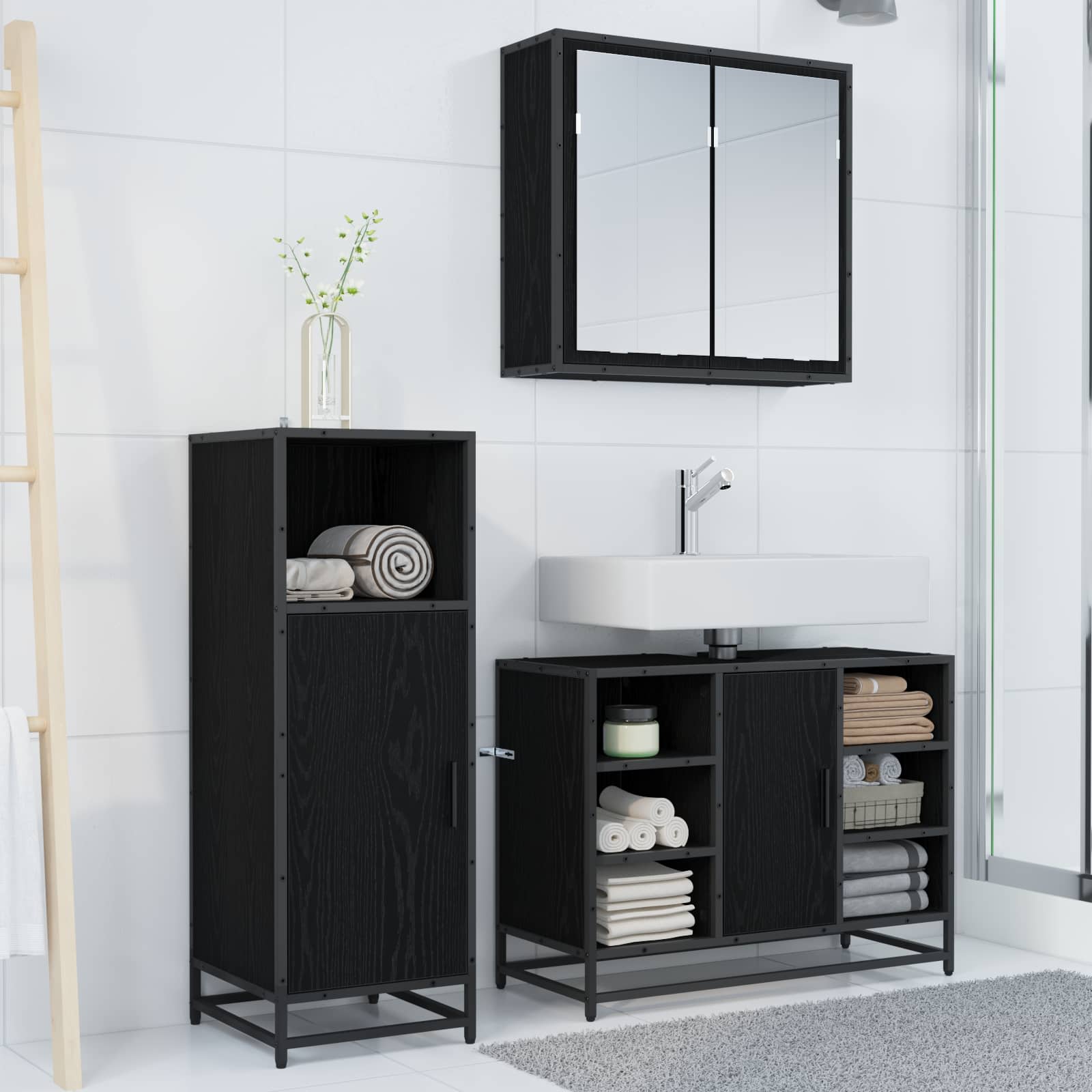 Ta komplet modernih kopalniških omaric je fantastičen dodatek vsaki sodobni kopalnici. S preprosto in pravokotno zasnovo združuje funkcionalnost in estetski videz, kar nudi nujno shranjevanje in hkrati izboljšuje dekoracijo. Mešanica inženirskega lesa in črnih kovinskih elementov odlično uravnava stil in uporabnost. Odlično se prilega modernim kopalnicam ter ponuja čist in organiziran videz, ki spodbuja učinkovito uporabo prostora. Komponirana iz inženirskega lesa: Ta komplet kopalniškega pohištva je zasnovan za vsakodnevno uporabo. Inženirski les zagotavlja dolgo življenjsko dobo in preprečuje deformacije, kar pomeni, da bo izdelek dolgo ostal lep. Enostavna montaža: Komplet vsebuje stensko omarico z ogledalom, omarico za umivalnik in ločeno prostostoječo omarico, kar omogoča odlične rešitve za shranjevanje. Ta postavitev olajša organizacijo in dostopnost, kar je pomembna funkcionalnost za vse kopalnice. Flush vrata: Z gladkimi flush vrati ustvarja enoten in minimalističen videz. Preprostost stilov vrat dodaja modernega pridiha in omogoča varno shranjevanje predmetov znotraj omaric. Integrirane police: Komplet vključuje police, ki zagotavljajo stabilno in dovolj prostora za shranjevanje. Te police so odlične za organizacijo toaletnih potrebščin in brisač, tako da imate vse na dosegu roke. Enostavna nega: Zasnovan je tako, da zahteva malo vzdrževanja. Samo obrišite površine z vlažno krpo, in takoj bo čist in urejen, kar ga naredi idealno izbiro za zaposlene gospodinje.