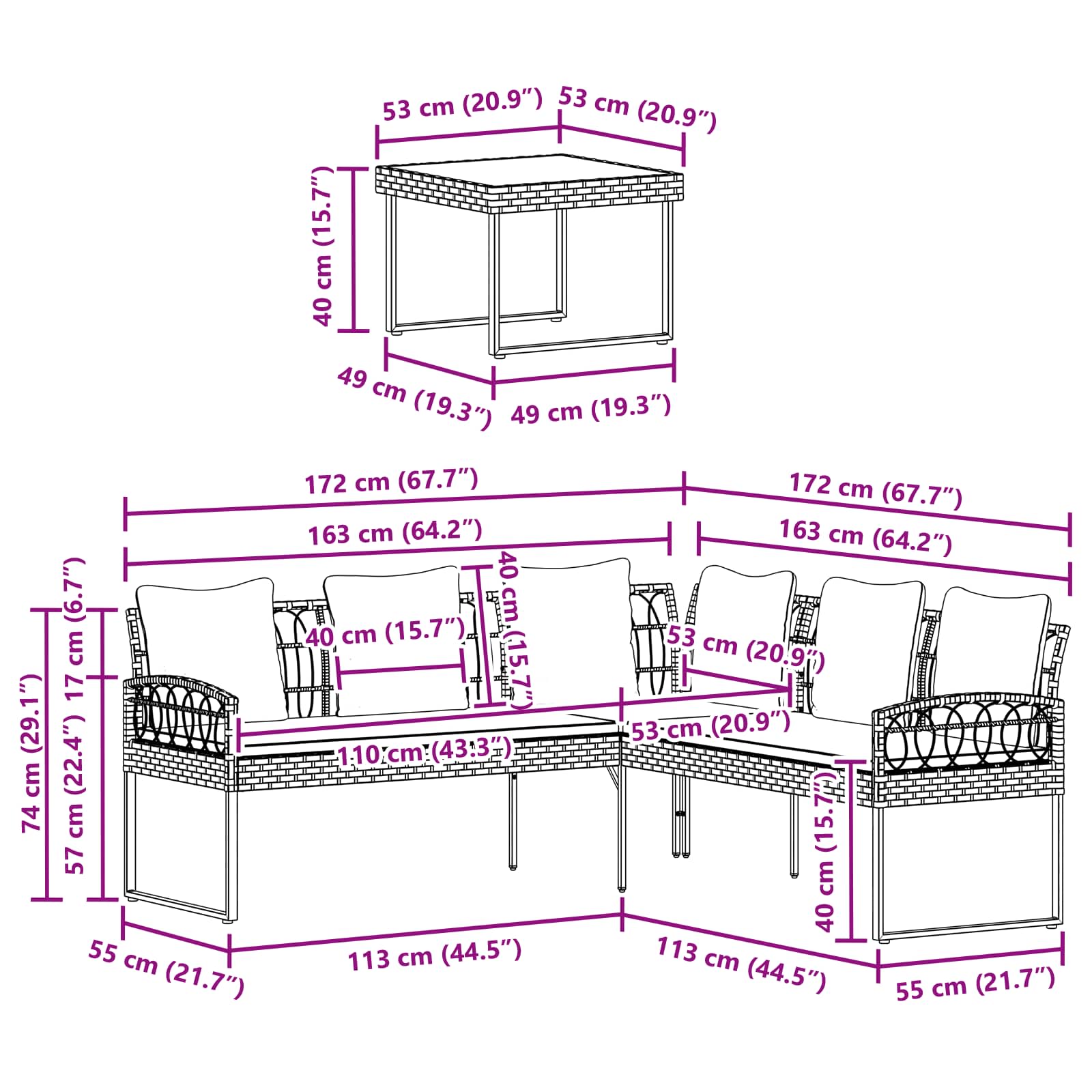 - 1 x L-sedna zofe: 172 x 172 x 74 cm (D x Š x V)