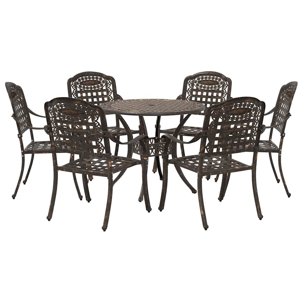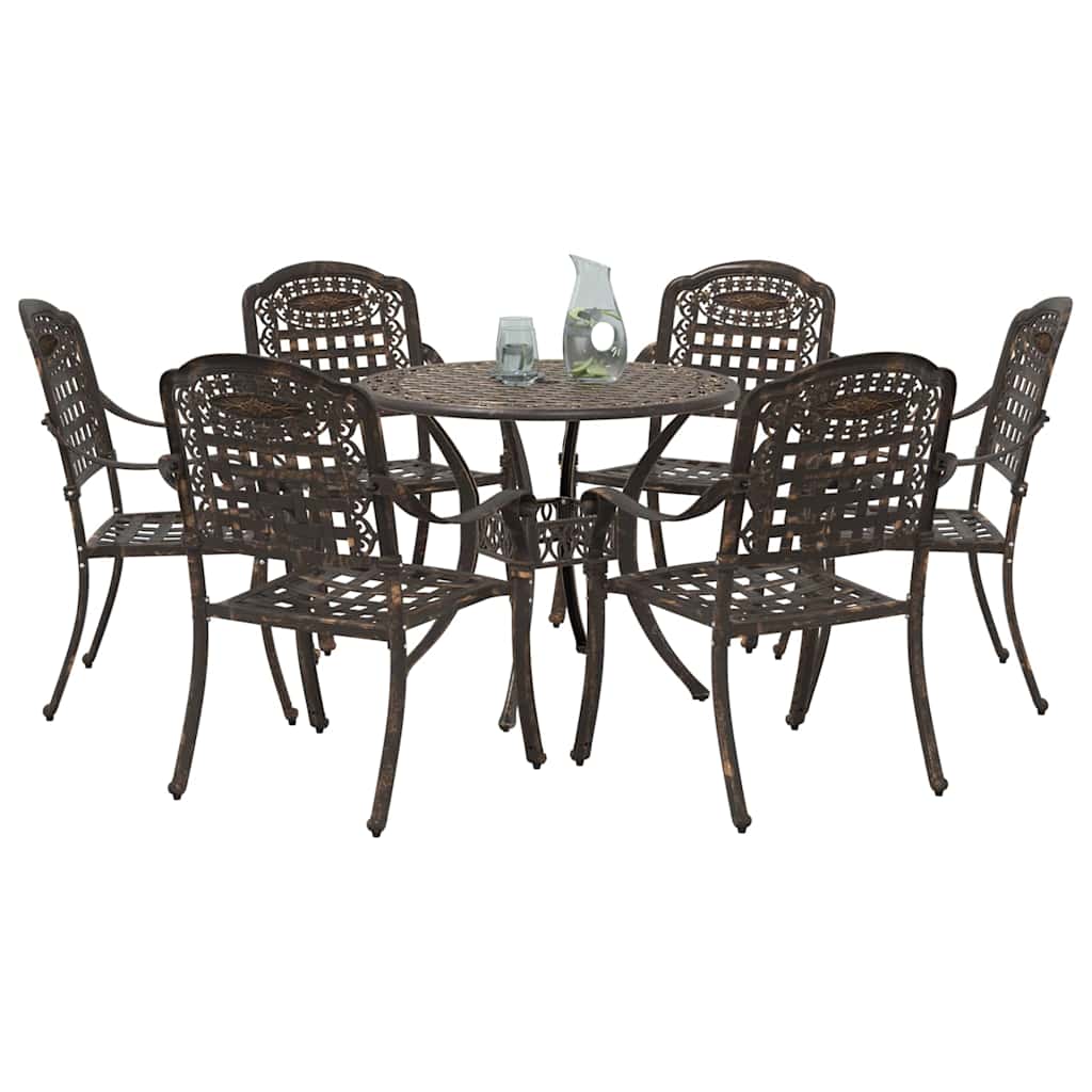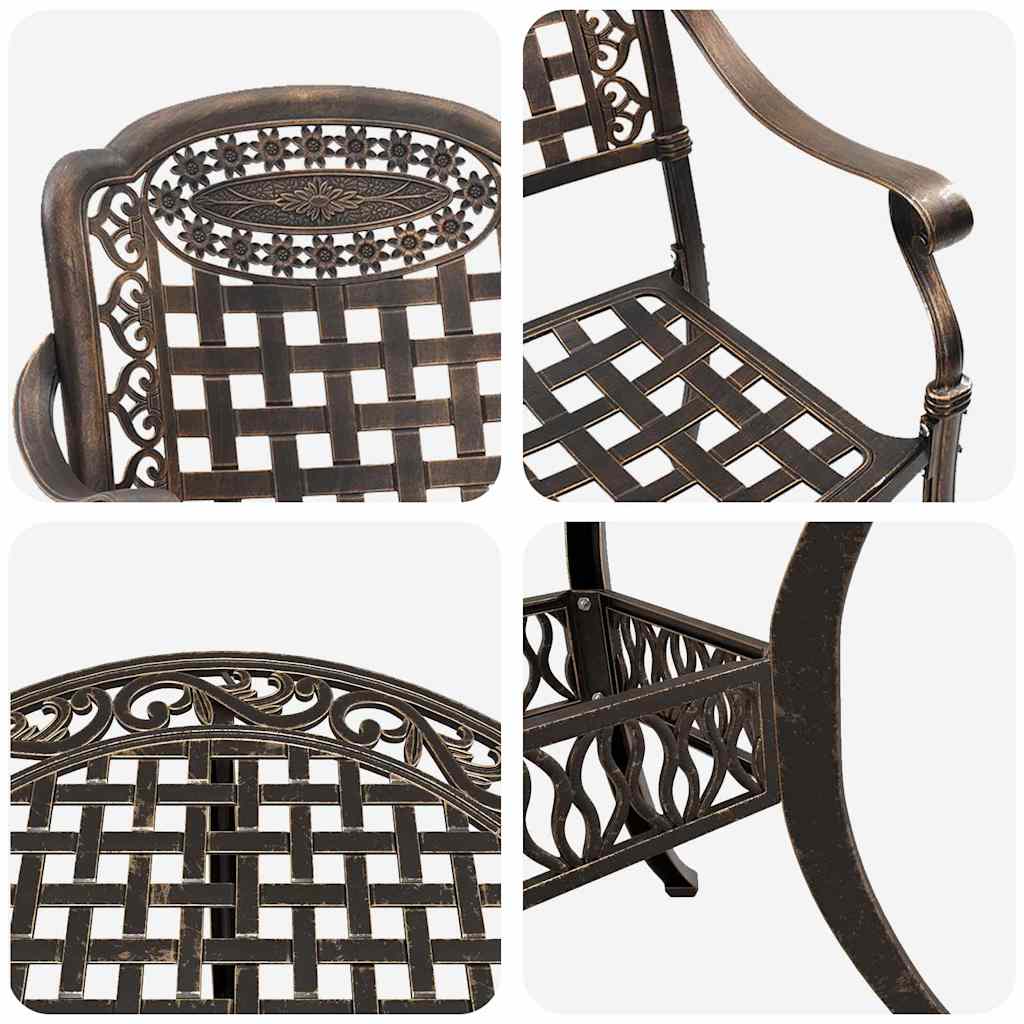 Ta jedilni set iz litega aluminija je res odlična izbira za vsako zunanjo okolje. S svojim klasičnim in tradicionalnim stilom se enostavno ujema z različnimi zunanjimi temami ter prinaša eleganco in funkcionalnost pri vsaki uporabi. Aluminijasta konstrukcija ne samo, da izboljšuje njegov videz, temveč tudi jamči odpornost. Prilagojen je za užitek v toplih dneh in se lahko prilagodi vsakemu neformalnemu ali formalnemu zunanjemu jedilnemu izkustvu – idealen je torej za vse, ki uživate v druženju na prostem. Popolnoma aluminijasta konstrukcija Jedilni set je v celoti izdelan iz aluminija, ki je znan po svoji trdnosti in odpornosti na vreme. To zagotavlja, da bo set ostal trden nakup za vsak vrt ali teraso ter je enostaven za vzdrževanje. Aluminij ohranja svoj videz in funkcionalnost tudi pri redni izpostavljenosti vremenskim vplivom. Tradicionalni stil Elegantna zasnova s klasičnimi detajli daje temu setu brezčasno privlačnost, ki se ujema z različnimi zunanjimi nastavitvami. Vsaka komponenta je zasnovana tako, da ponudi luksuzni videz v kombinaciji z praktičnostjo, kar ga naredi ne le začetnik pogovorov, temveč tudi vabo za srečanja. Prilagojeni ravni nasloni za roke Aluminijasti nasloni za roke so zasnovani z elegantno obliko, ki nudi udobje in ohranja estetsko celovitost seta. Ti nasloni zagotavljajo udobno izkušnjo, kar naredi dolge obroke na prostem prav prijetne. Praktična sestava Set se preprosto sestavi s pomočjo dveh oseb in izvijača. Ta hitra in enostavna sestava omogoča, da hitro pripravite svoj vrt ali teraso za gostovanje, kar vam daje več časa za užitek. Navodila za nego Vzdrževanje jedilne garniture je enostavno. Priporočamo, da jo pokrijete, ko ni v uporabi, da podaljšate življenjsko dobo. Redno obrišite z vlažno krpo, da ostane privlačna in funkcionalna del vaše zunanje površine.