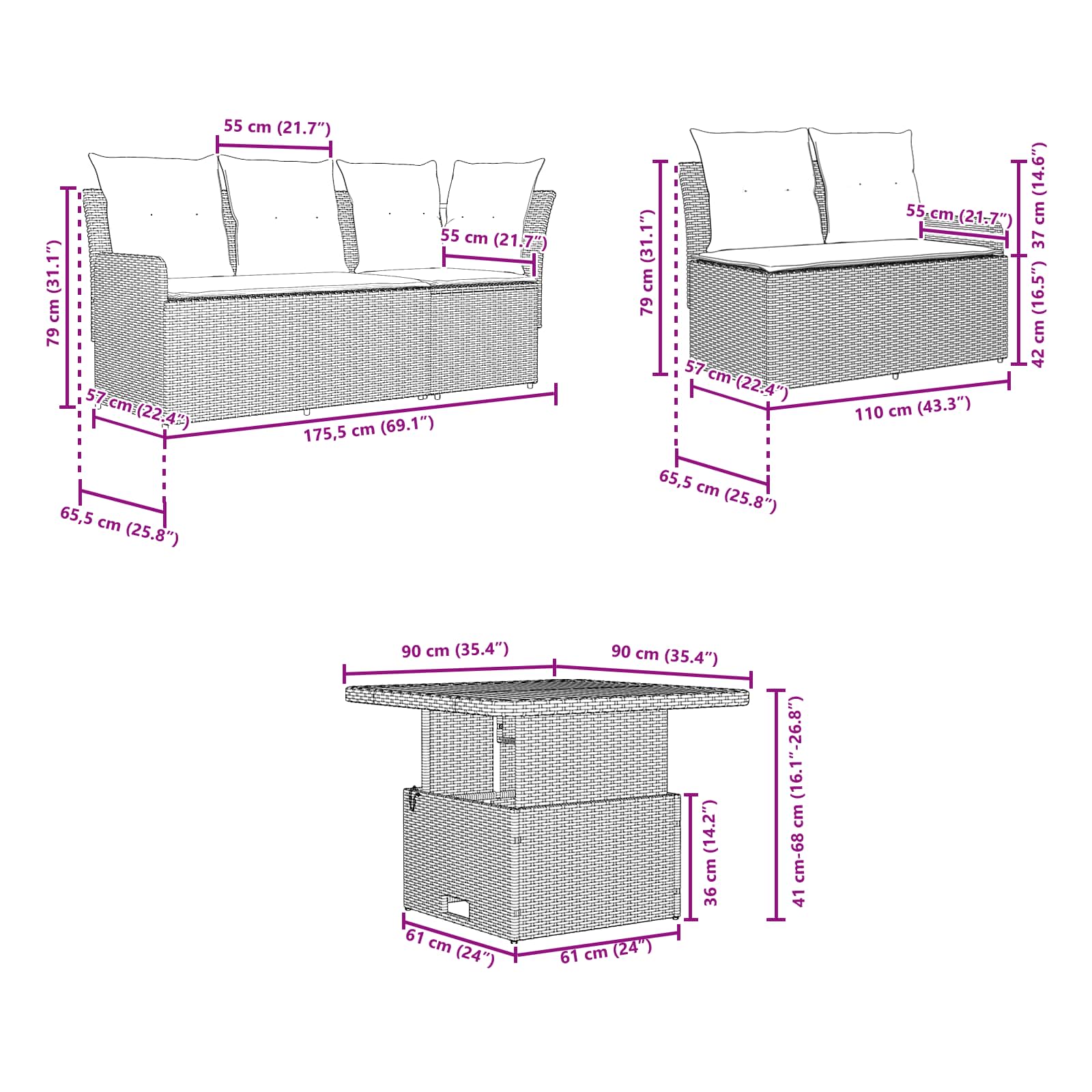 Ta moderni pohištveni set je zasnovan za notranje in zunanje prostore. S preprostim in funkcionalnim dizajnom ponuja čiste linije in minimalne okraske, kar povečuje njegovo privlačnost. Narejen je iz PE ratana in akacijevega lesa, kar prinaša sodoben občutek v vsak prostor, idealen za preživljanje prostega časa s prijatelji in družino. Na terasi ali v prijetni dnevni sobi lepo dopolnjuje različne sloge, nudi pa tudi trajnost in stil. Topli rjavi tone in mehke blazine ustvarjajo sproščujoče okolje za uživanje. Materiali: Ta set iz PE ratana se ponaša s estetskim videzom in je odporen na vremenske vplive. PE ratan je trpežen in preživi UV žarke ter vlago, kar izboljša njegovo življenjsko dobo. Okvir iz prašno lakiranega jekla nudi zanesljivo podporo in ohranja lahkotno zasnovo, primerno za različne postavitve. Vključene komponente: Udobne blazine z odstranljivimi pokrovčki omogočajo enostavno vzdrževanje. Pena in poliestrska vlakna zagotavljajo dolgotrajno udobje. Odstranljive blazine z zadrgami nudijo enostavno čiščenje, videz blazin pa pripomore k sproščujočem vzdušju. Funkcije / oblikovanje: Nastavljive noge omogočajo enostavno prilagojevanje neenakemu terenu, kar zagotavlja stabilnost kjerkoli. Ta praktična funkcija povečuje vsestranskost seta, kar omogoča uporabnost v različnih okoljih. Priporočena uporaba: Primerno za terase, deke, vrtove ali notranje bivalne prostore, ta set je prilagodljiv različnim okoljem. Njegov sodoben videz in nevtralne barve se ujemajo z obstoječim pohištvom. Vzdrževanje: Čistiti ga je treba z suho krpo in se izogibati ostrim kemikalijam. Uporaba vodoodpornega pokrova, ko set ni v uporabi, podaljša njegovo življenjsko dobo, še posebej med slabim vremenom.