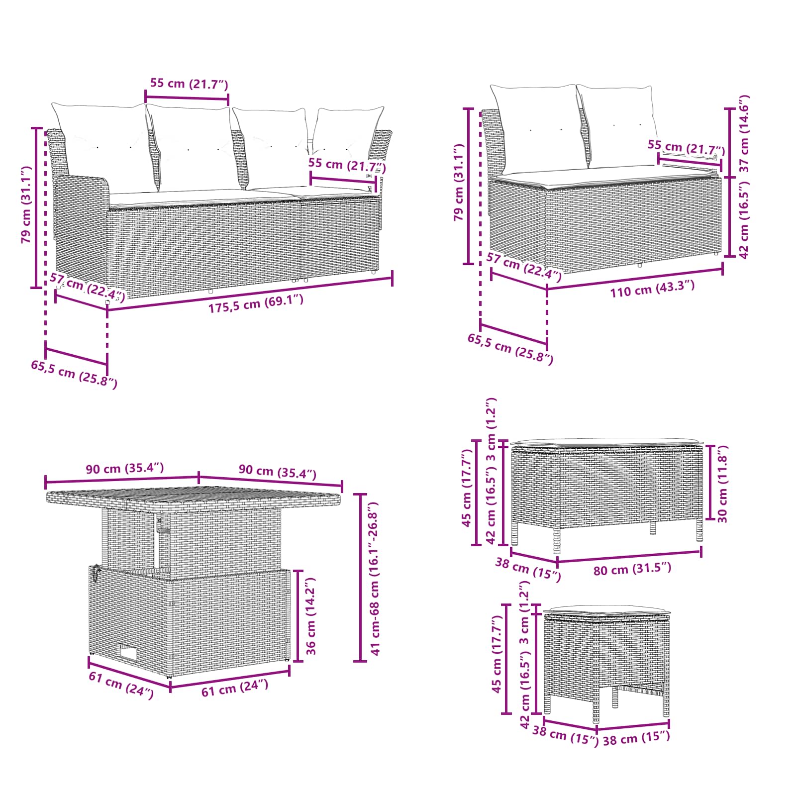 Ta moderni pohištveni set je zasnovan za notranje in zunanje prostore. S preprostim in funkcionalnim dizajnom ponuja čiste linije in minimalne okraske, kar povečuje njegovo privlačnost. Narejen je iz PE ratana in akacijevega lesa, kar prinaša sodoben občutek v vsak prostor, idealen za preživljanje prostega časa s prijatelji in družino. Na terasi ali v prijetni dnevni sobi lepo dopolnjuje različne sloge, nudi pa tudi trajnost in stil. Topli rjavi tone in mehke blazine ustvarjajo sproščujoče okolje za uživanje. Materiali: Ta set iz PE ratana se ponaša s estetskim videzom in je odporen na vremenske vplive. PE ratan je trpežen in preživi UV žarke ter vlago, kar izboljša njegovo življenjsko dobo. Okvir iz prašno lakiranega jekla nudi zanesljivo podporo in ohranja lahkotno zasnovo, primerno za različne postavitve. Vključene komponente: Udobne blazine z odstranljivimi pokrovčki omogočajo enostavno vzdrževanje. Pena in poliestrska vlakna zagotavljajo dolgotrajno udobje. Odstranljive blazine z zadrgami nudijo enostavno čiščenje, videz blazin pa pripomore k sproščujočem vzdušju. Funkcije / oblikovanje: Nastavljive noge omogočajo enostavno prilagojevanje neenakemu terenu, kar zagotavlja stabilnost kjerkoli. Ta praktična funkcija povečuje vsestranskost seta, kar omogoča uporabnost v različnih okoljih. Priporočena uporaba: Primerno za terase, deke, vrtove ali notranje bivalne prostore, ta set je prilagodljiv različnim okoljem. Njegov sodoben videz in nevtralne barve se ujemajo z obstoječim pohištvom. Vzdrževanje: Čistiti ga je treba z suho krpo in se izogibati ostrim kemikalijam. Uporaba vodoodpornega pokrova, ko set ni v uporabi, podaljša njegovo življenjsko dobo, še posebej med slabim vremenom.