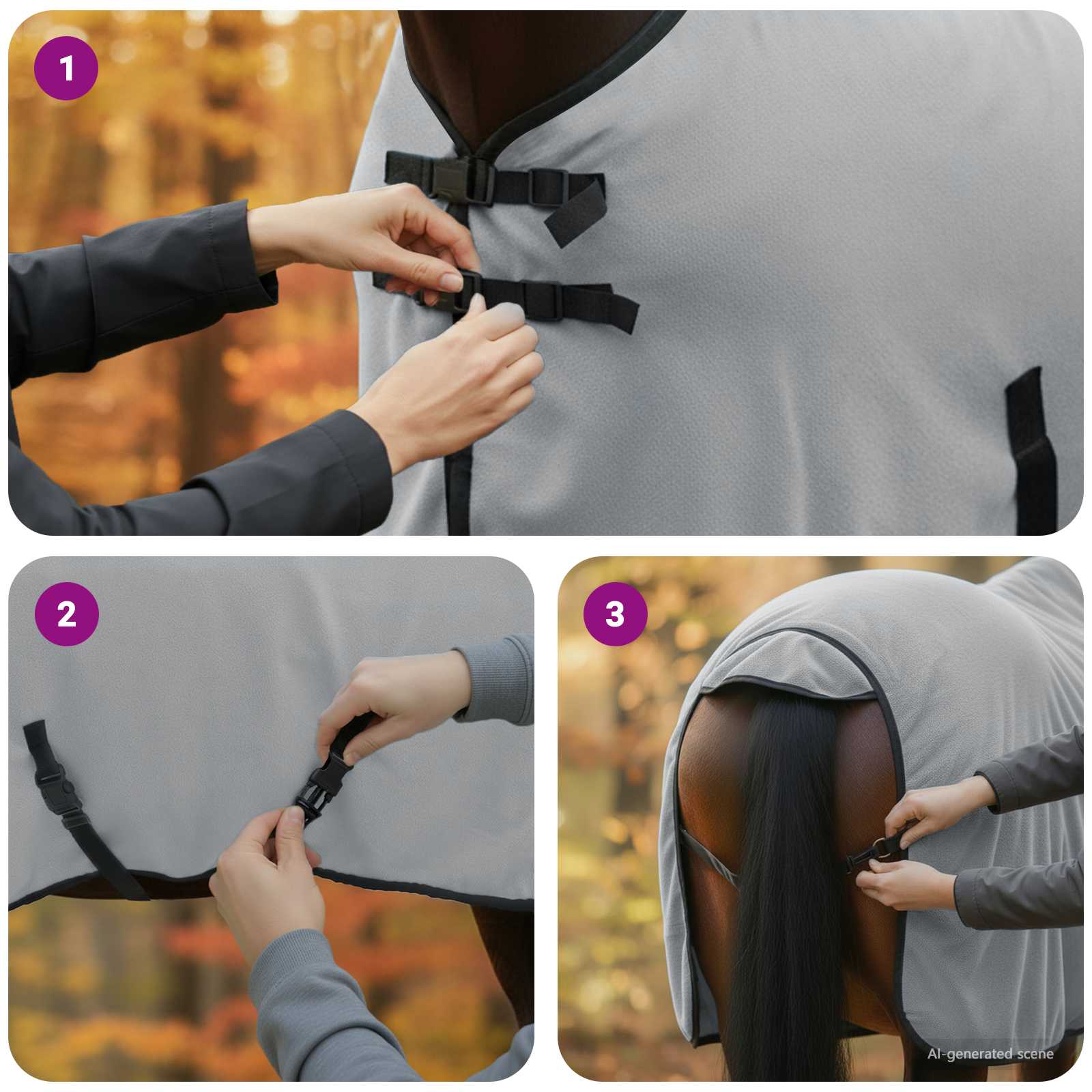 Ta odeja za konje kombinira moderni slog in praktičnost, da vašemu konju zagotovi toploto in udobje pozimi. Narejena iz trpežnega poliestra s sladko žametno teksturo, prinaša kanček luksuza. S preprostim in stilskim dizajnom je namenjena izključno zunanji uporabi, kar zagotavlja, da vaš konj uživa v naravi brez neprijetnosti. Njena tesna prileganje je idealna za ohranjanje konjev v udobju, kar jo dela super dodatek za zimski garderobi. Podrobnosti o materialu: Odeja je narejena iz poliestra, kar pomeni, da je zelo trpežna in odporna na vremenske vplive. Žametna tekstura ne samo, da daje luksuzni občutek, ampak nudi tudi udobje vašemu konju in zagotavlja toploto brez draženja. Odstranljiva prevleka: Funkcija snemljive prevleke omogoča super enostavno čiščenje. Preprosto jo odstranite in operite v pralnem stroju pri 30 stopinjah — hitra rešitev za ohranjanje čistoče in dolgoživost odeje. Prilagodljive lastnosti: Odeja ima snemljive dele, tako da jo lahko prilagodite glede na velikost vašega konja. Ta funkcionalnost zagotavlja, da odeja dobro prilega in preprečuje vdor hladnega zraka. Zimska nujnost: Specifično zasnovana za zimsko uporabo, ta odeja ohranja konje tople tudi pri nizkih temperaturah, saj nudi odlično izolacijo. Enostavno vzdrževanje: Hvala trpežnemu materialu, ki ga lahko perete v pralnem stroju, in enostavnim odstranljivim komponentam, je skrb za to odejo enostavna, kar zagotavlja, da ostaja sveža in čista za zdravje in udobje vašega konja.