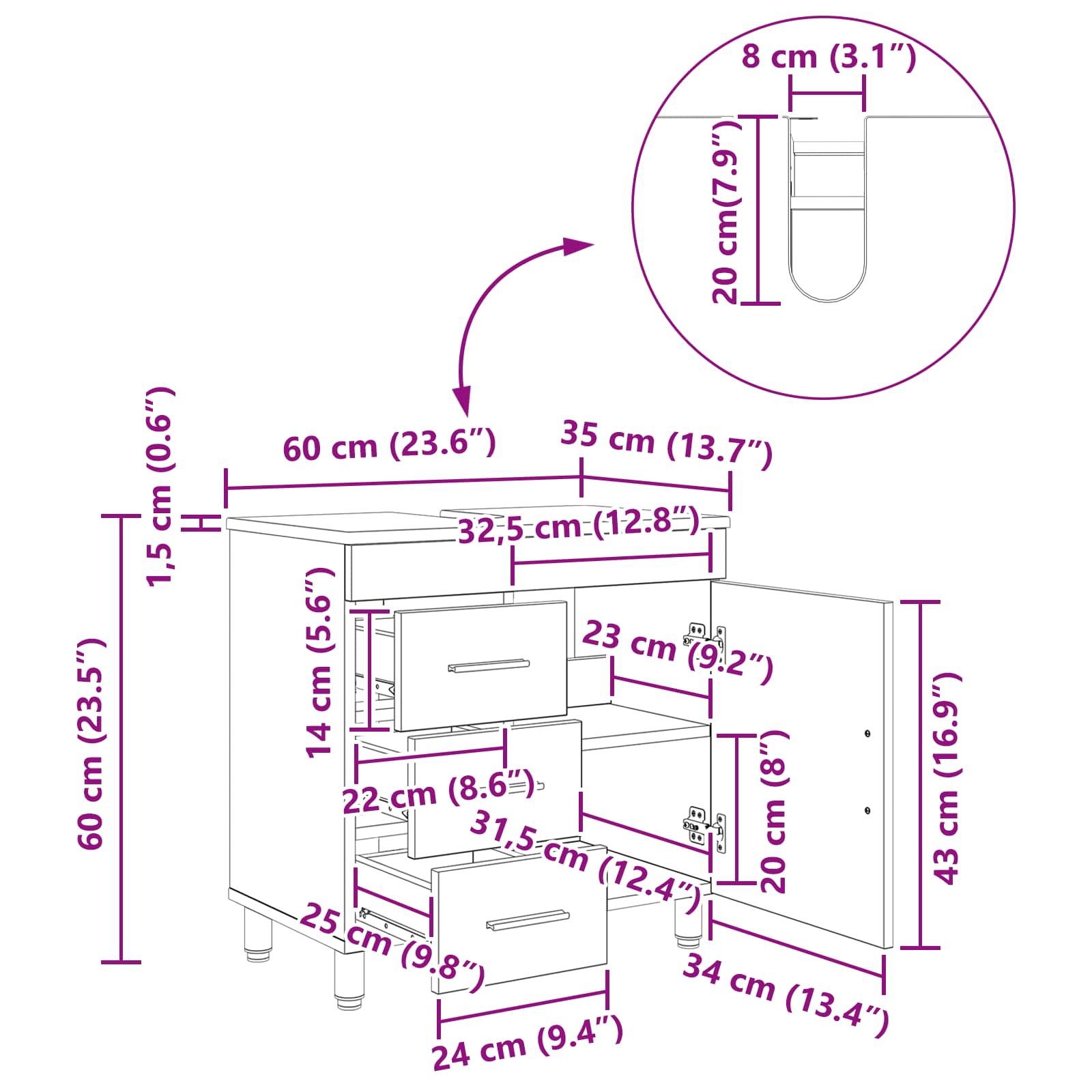 - Splošne dimenzije: 60 x 35 x 60 cm (D x Š x V)