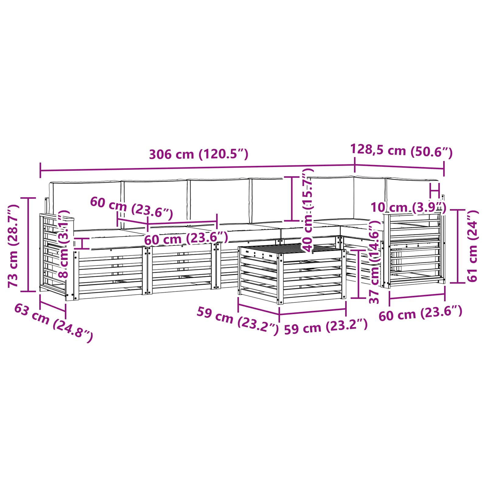 - 1 x Kotna sedežna garnitura: 63 x 63 x 73 cm (D x Š x V)