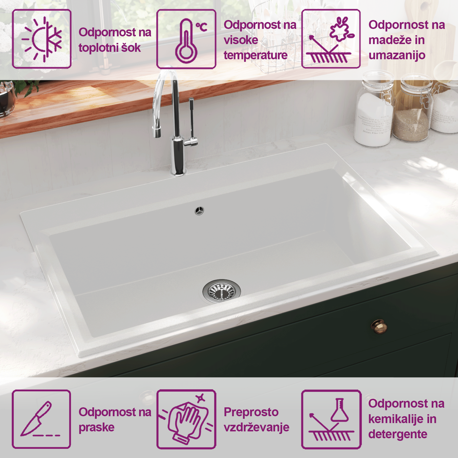 Ta granitni kuhinjski umivalnik je tam, kjer se moderno oblikovanje sreča z trdno obrtniško izdelavo, zato je prava senzacija v vsaki sodobni kuhinji. Njegove elegantne linije in minimalistični stil nudijo privlačnost in uporabnost, ki ju obožujejo tako kuharji kot priložnostni kuhalci. Prostornina je super za vse vaše kuhinjske potrebe – od pranja velikih loncev do priprave elegantnih jedi. Graniten material Narejen iz vrhunskega granita, je estetsko prijeten in res trpežen. Umivalnik ostaja videti super in dobro deluje dolga leta, kar ga naredi za obvezno opremo v vsaki kuhinji. Pravokotna oblika Klasična pravokotna oblika dopolnjuje njegov moderni videz in optimizira kuhinjski prostor. Čiste linije in ostri robovi mu dajejo eleganten občutek, ki se prilega vsakemu dekorju. Prostorne dimenzije Velikost je res pomembna! Pri 79 x 50 x 31 cm ima ta umivalnik dovolj prostora za vsakodnevno uporabo, od velikih kuharskih pripomočkov do občutljivih jedi. Popoln je za domove, ki radi gostijo. Samo za notranjo uporabo Namenjen je notranjim kuhinjam, a njegov vsestranski stil se enostavno prilagodi različnim kuhinjskim postavitvam, kar vam daje prilagodljivost pri razporeditvi. Enostavno vzdrževanje Hitro brisanje s krpo je vse, kar potrebujete, da ostane brezhiben. Granit naravno odganja madeže in bakterije, kar vam pomaga ohranjati čisto kuhinjo brez težav.