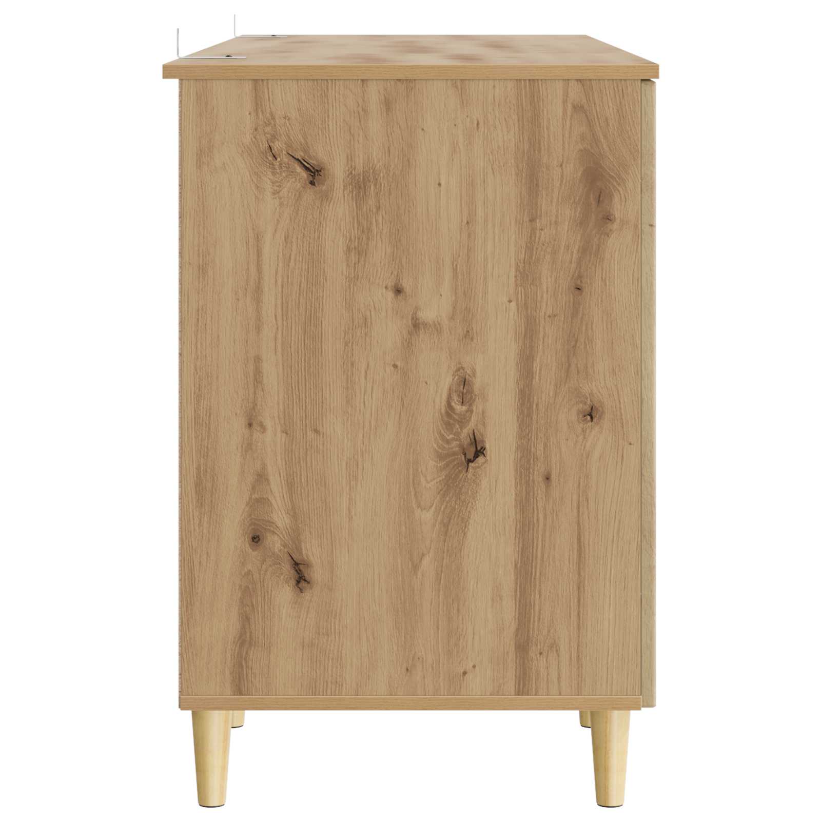 Moderna miza združuje vintage čar in moderno funkcionalnost – čudovit dodatek za vsako dnevno sobo ali domačo pisarno. Ta pravokotna miza iz inženirskega lesa ponuja funkcionalnost in eleganco, z dizajnom, ki odraža preteklost. S toplim rjavim tonom prinaša prijeten vizualni učinek, ki dvigne vzdušje v prostoru. Ima dovolj prostora za shranjevanje in trdno površino, kar jo dela primerno tako za profesionalne kot osebne potrebe. Njena edinstvena kombinacija stila in uporabnosti očara uporabnike. Materiali iz inženirskega lesa: Narejena iz kakovostnega inženirskega lesa, miza simbolizira kakovost in zanesljivost. Inženirski les je trden in lepo obdelan, združuje vintage oblikovanje s trajnostjo. Ta material nudi stabilno podlago in omogoča, da miza prenese vsakodnevne obremenitve, ne glede na to, ali jo uporabljate za učenje ali delo. Funkcionalne police: Shramba je enostavna z vgrajenimi policami, ki nudijo prostor za pisalne potrebščine, knjige in vse, kar potrebujete. Te police se naravno vključijo v dizajn mize, kar olajša čiščenje in ohranja prostor urejen, kar pripomore k produktivnosti. Oblikovanje zoženih nog: Zožene noge mize so estetsko privlačne in funkcionalne, saj nudijo stabilnost in sodoben videz, ki se prilega vsakemu stilu notranjega oblikovanja. S kančkom elegance noge izboljšajo splošno zasnovo mize, združujejo stil in trdno konstrukcijo. Vsestrana uporaba: Zasnovana, da se prilega različnim okoljem, je moderna miza odlična za pisanje, domačo pisarno ali tudi kot osrednji kos pohištva v dnevni sobi. Njena vsestranskost jo čini primerno za vsakogar, ki išče stil in funkcionalnost v svojem delovnem okolju. Praktična oskrba in vzdrževanje: Za vzdrževanje mize potrebujete le vlažno krpo, kar zagotavlja, da ostane v odličnem stanju. Ta minimalna skrb pomeni, da miza zlahka obdrži svoj eleganten videz, kar vam pusti več časa za delo in sprostitev.