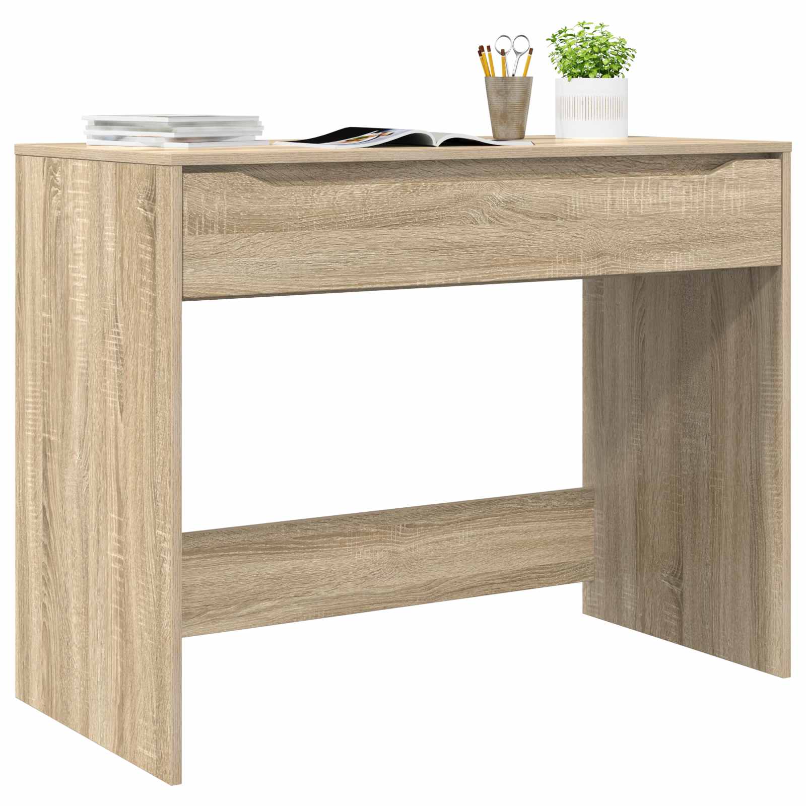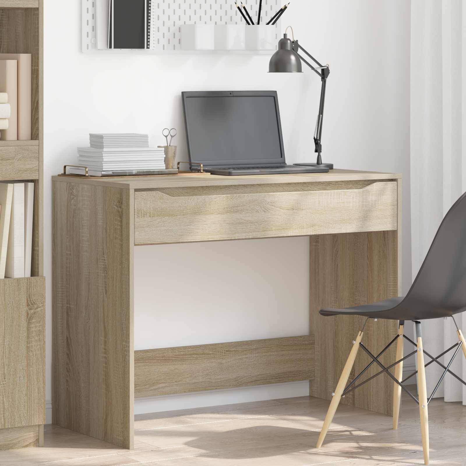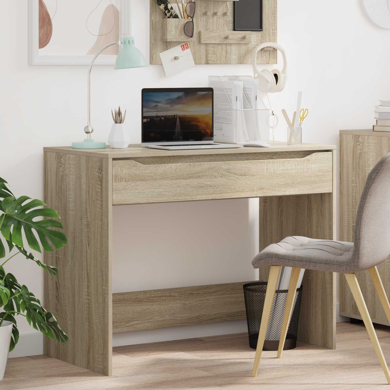 Ta lesena pisalna miza združuje preprosto zasnovo z uporabnimi funkcijami, kar jo dela idealno za pisarniška in domača okolja. Ima pravokotno obliko, ki ponuja stabilno površino za pisanje, delo na računalniku in druge vsakdanje naloge. S čistimi linijami in praktičnim predalom se prilega različnim stilom notranje opreme ter zagotavlja funkcionalno rešitev za vse, ki želijo urejen delovni prostor. Trajen les: Ta miza je iz inženirskega lesa, kar pomeni, da je stabilna in dolgotrajna. Njena teksturirana površina prenese vsakodnevno rabo, a še vedno izgleda odlično. Odlično ponuja trdno podlago za razne delovne in študijske naloge. Praktičen predal: Vgrajen predal nudi prostor za shranjevanje pisarniškega materiala ali majhne elektronike. Ta dodatek preprečuje nered na delovni mizi, vse kar potrebujete pa je enostavno dostopno. Vsestrana raba: Ta miza se dobro prilega različnim okoljem, od domačih pisarn do študijskih prostorov. Njena zasnova omogoča, da se prilagodi različnim prostorom, kar jo naredi praktično izbiro za vsako notranjo opremo. Preprosta zasnova okvirja: Miza ima odprto zadnjo stran in močne noge. Minimalistični videz omogoča boljšo obvladovanje kablov ter daje čist in organiziran izgled vašemu prostoru. Enostavno vzdrževanje: Za čist videz obrišite s mehko, vlažno krpo. Gladka površina zahteva malo vzdrževanja, le enostavno obrisovanje, da ostane lepa. Izogibajte se močnim kemikalijam, da miza zdrži čim dlje.