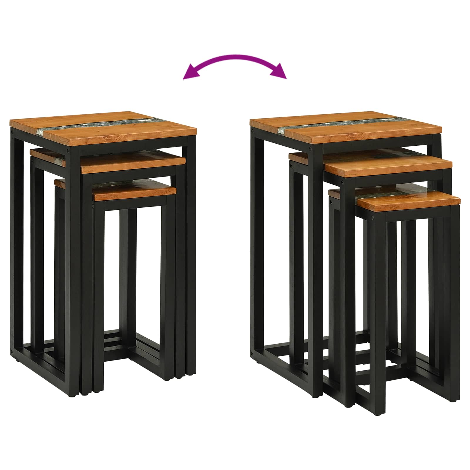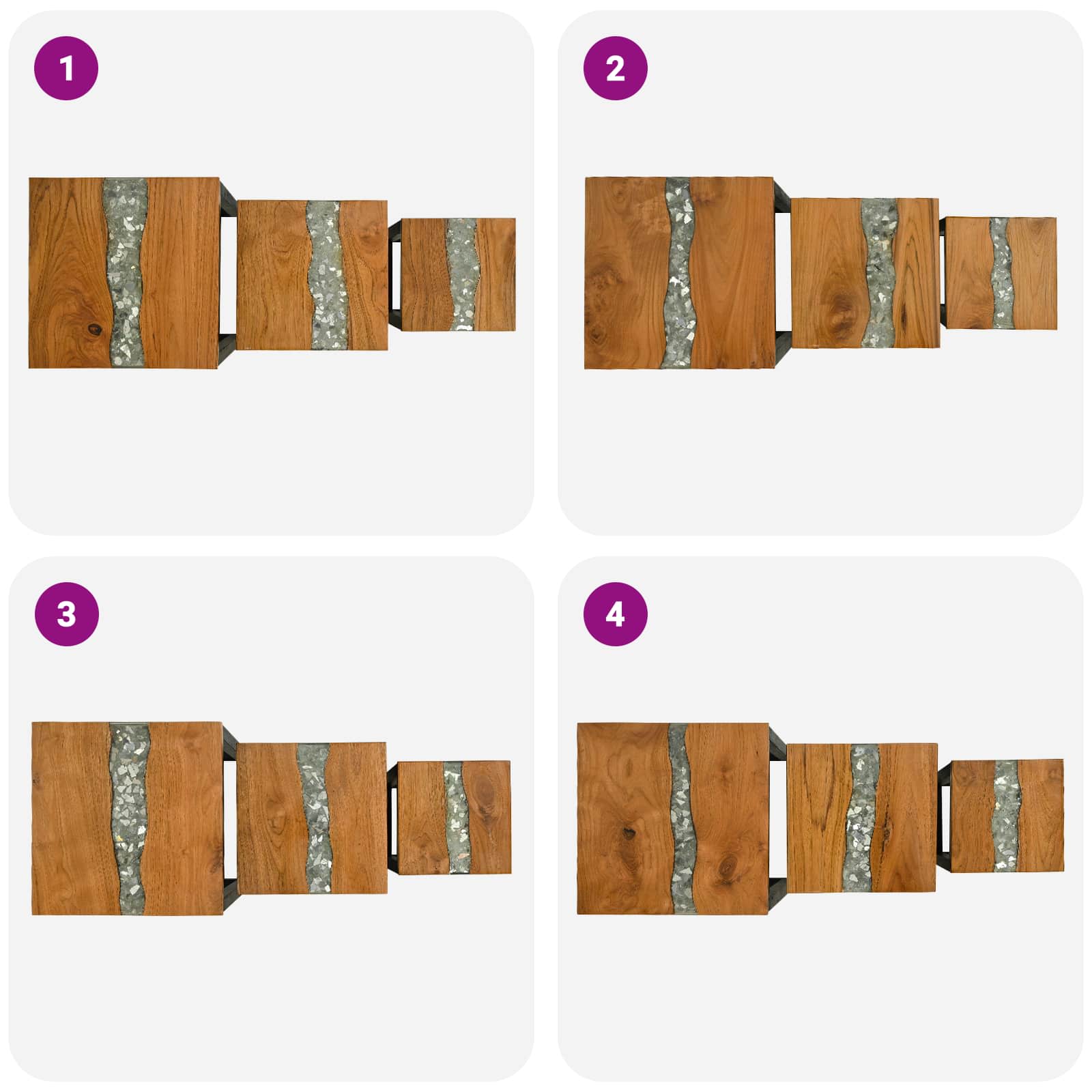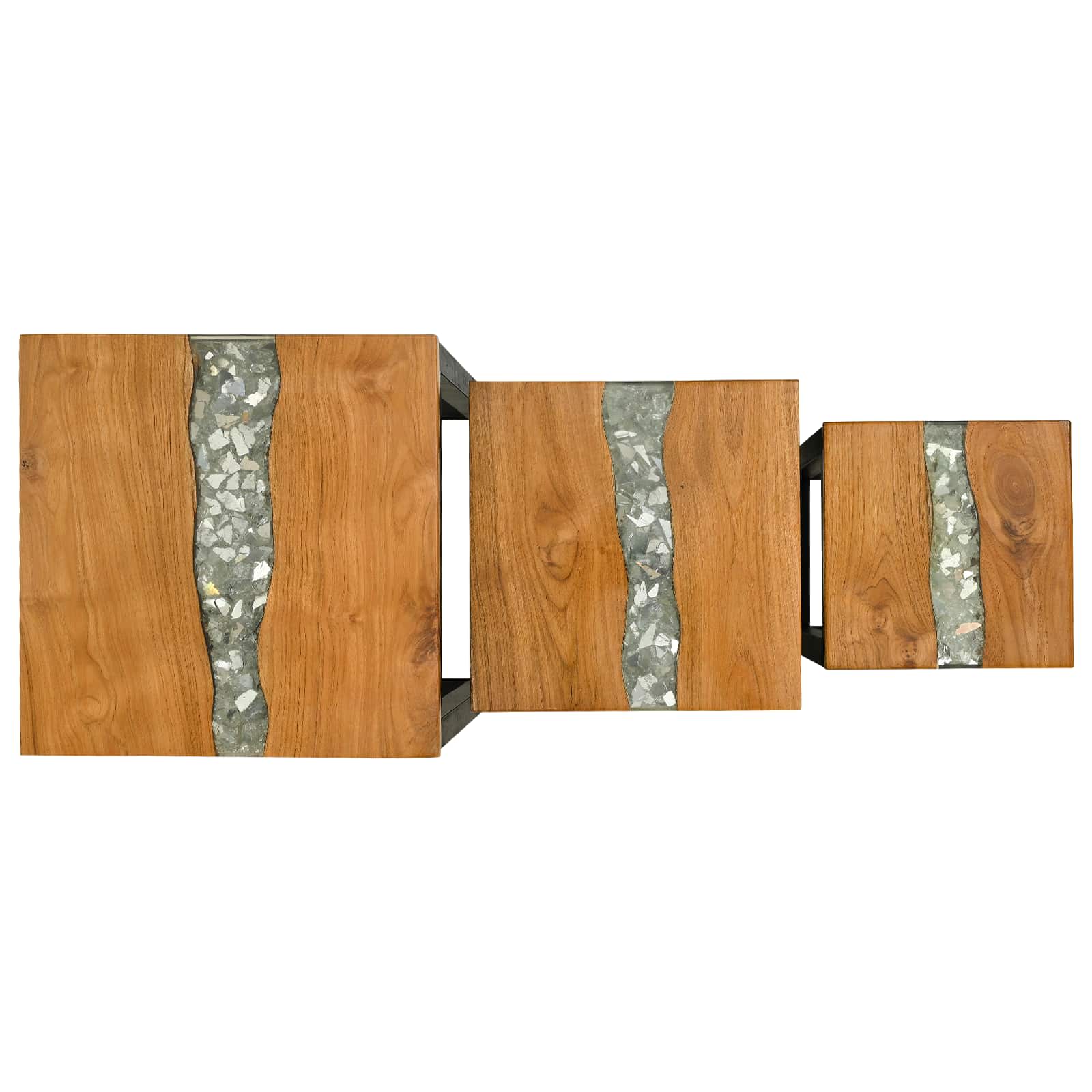 Ta set gnezditvenih miz prinaša Stila in funkcionalnost v vsako dnevno sobo. S svojo elegantno pravokotno obliko je idealen za tiste, ki cenijo sodoben minimalizem. Super je za urbana okolja, kjer je prostor dragocen. Mize se lahko gnezditveno postavijo skupaj, kar ustvarja prilagodljiv in učinkovit prostor za vas. Trden tikov les: Te mize so narejene iz pravega tikovega lesa, ki se ponaša z bogatimi rjavimi odtenki ter naravnimi vzorci. Nudi klasičen in sodoben videz ter zagotavlja moč in vzdržljivost za vsakodnevno uporabo. Edinstven les in smolni vzorec: Kontrastne teksture lesa in smole se brezhibno zlijejo, kar ustvarja čudovit vzorec. Razbito steklo na vrhu doda eleganten pridih in naredi mizo privlačno za vsako druženje. Prilagodljivost varčevanja s prostorom: Te mize se enostavno gnezditveno pospravijo, kadar jih ne potrebujete. Funkcija varčevanja s prostorom omogoča prilagodljivo ureditev, saj jih lahko uporabljate bodisi ločeno bodisi skupaj. Jeklena konstrukcija okvirja: Črno jeklo nudi močno osnovo in se lepo ujema z tikovimi površinami, kar ustvarja ravnotežje in moč za vsakodnevne obremenitve. Enostavna navodila za nego: Zanesljivi materiali in preprosti načini čiščenja olajšajo vzdrževanje teh miz. Vlažna krpa bo hitro obnovila njihov sijaj in ohranila lepoto brez vsakodnevnega prahu in madežev.