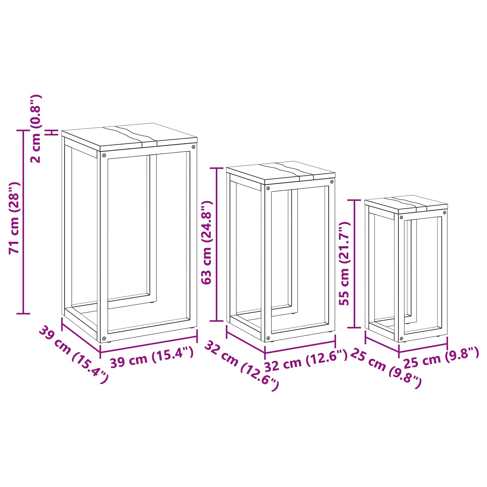 - 1 x Srednja gnezditvena miza: 32 x 32 x 63 cm (D x Š x V)