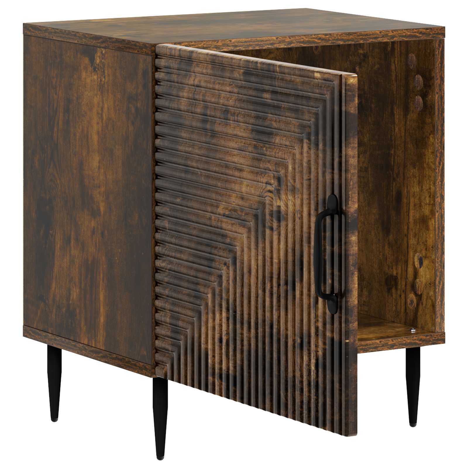 Ta moderna nočna omarica je popoln dodatek za udobno in urejeno spalnico. S svojim vintage šarmom se prilega eleganten dizajn, ki uteleša duh preteklih let in hkrati izpolnjuje današnje praktične potrebe. Je skorajda izdelana za vsakodnevno uporabo in prinaša tako vizualno veselje kot funkcionalno dodano vrednost v vašem domu. Kvaliteta materiala: Ta omarica iz inženirskega lesa nudi robustno strukturo in klasičen videz. Lesna konstrukcija je trpežna in primerna za vsakodnevno uporabo, kar zagotavlja dolgo zadovoljstvo. Dizajn komponent: Ima zožene kovinske noge za sodoben videz in palice za ročaje za preprost dostop do predalov. Njena vrteča vrata pri 90° dodajajo enostavnost in praktičnost. Funkcionalne značilnosti: Nudi veliko prostora za osebne stvari, knjige ali drobnarije, kar izboljšuje organizacijo in preprečuje nered v spalnici. Vsestrana uporaba: Ta kos brez težav dopolnjuje različne spalniške dekoracije, saj ponuja funkcionalnost in stil. Popolna je za ob postelji ali kot akcentni kos v kateremkoli prostoru. Nege in vzdrževanje: Zelo enostavno vzdrževanje z vlažno krpo ji pomaga ohraniti videz. Redno brisanje bo podaljšalo njeno življenjsko dobo in ohranilo privlačno estetiko še dolga leta.