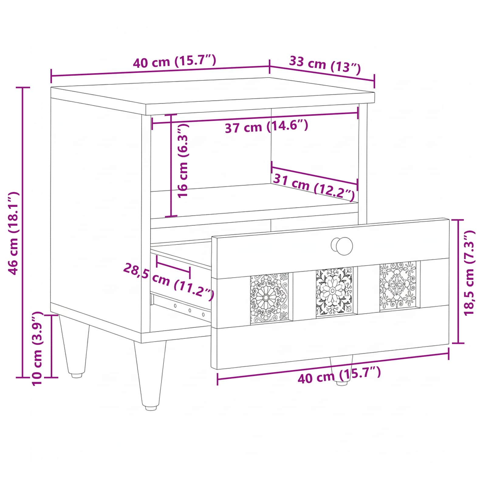 Lesena nočna omarica je odličen dodatek vsaki spalnici. Združuje uporabnost in klasičen dizajn, narejena iz trdega mangovega lesa, pa prinaša toplino in stil. Njene kompaktne dimenzije 40 x 33 x 46 cm so popolne za nočne potrebščine, ne glede na to, ali gre za knjigo ali očala, ki jih želite odložiti ob koncu dneva. Materiali: Ta nočna omarica je izdelana iz trdega mangovega lesa, ki se ponaša z bogatimi vzorci in dolgo življenjsko dobo, kar ji omogoča, da se prilega vsakodnevni uporabi, ne da bi pri tem žrtvovala slog. Njena globoka barva dodaja toplino in eleganco, kar dopolnjuje raznolike teme v dekorju. Vključene komponente: Omarica vključuje brezšivno oblikovanje, ki omogoča skladnost med okvirjem in predali. S prostornim predalom ponuja dovolj prostora za shranjevanje vsega, od knjig do elektronskih naprav. Preprosta zasnova poskrbi za urejenost v sobi. Funkcionalnost / Oblika / Zasnova: Ta omarica z velikim predalom ohranja prostor urejen in organiziran. Njena zasnova omogoča enostavno uporabo, gladke površine pa izboljšajo vsakodnevno interakcijo. Klasična pravokotna oblika je praktična rešitev za shranjevanje. Priporočena uporaba: Idealna je za spalnice, saj se prilagaja tako sodobnim kot tradicionalnim stilom. Ne glede na to, ali je ob sodobnem okviru postelje ali vintage omarici, njen nevtralen dizajn prinaša vsestranskost. V manjših prostorih učinkovito izkoristi prostor. Vzdrževanje: Redno brišite s mehko krpo in se izogibajte ostrim kemikalijam, da ohranite njen lep videz. Ta preprosta rutina pomaga pri dolgoročnem vzdrževanju površine, njena trdna konstrukcija pa ostaja v odlični formi in sijaju, kar ji omogoča, da ostane ključni element vaše spalnice.