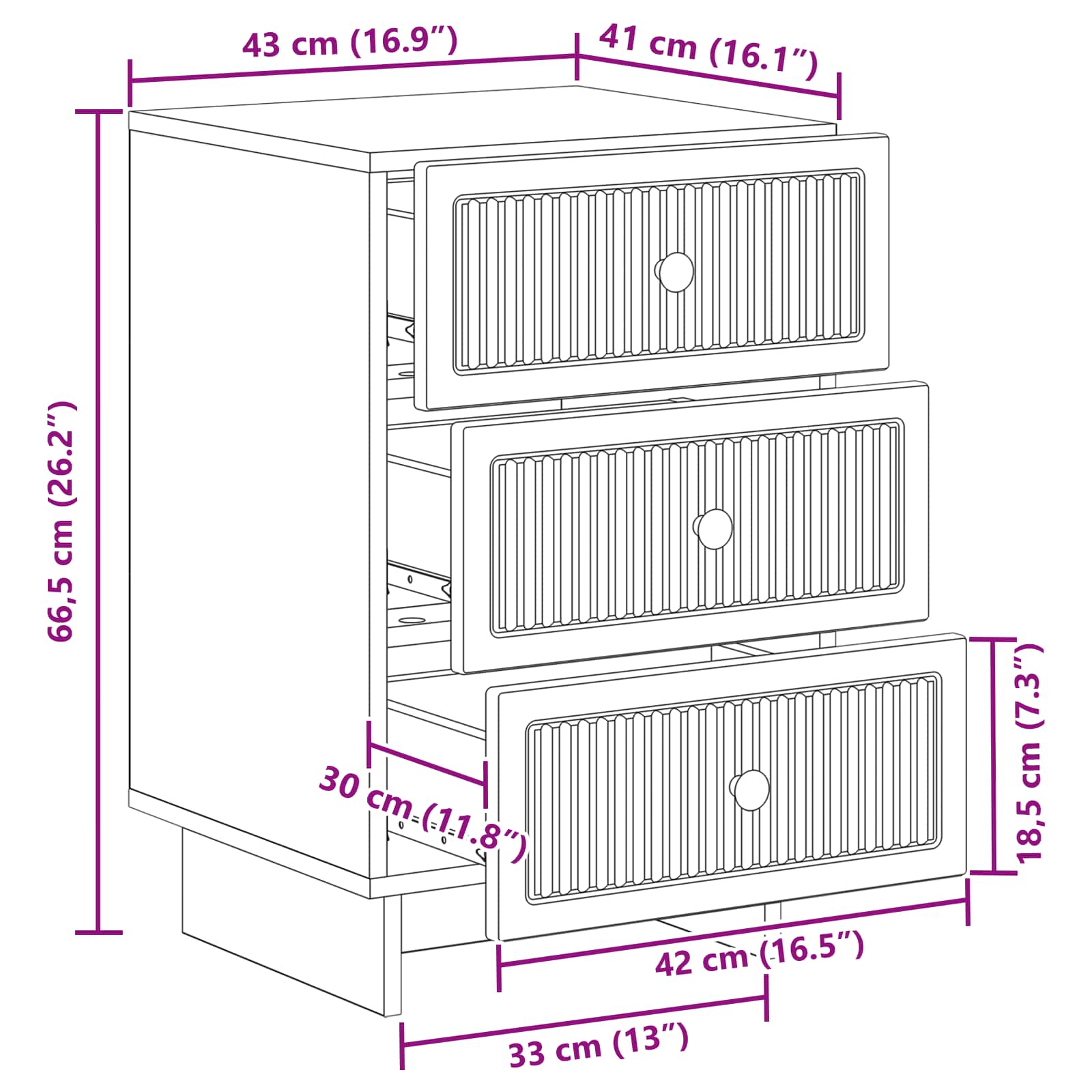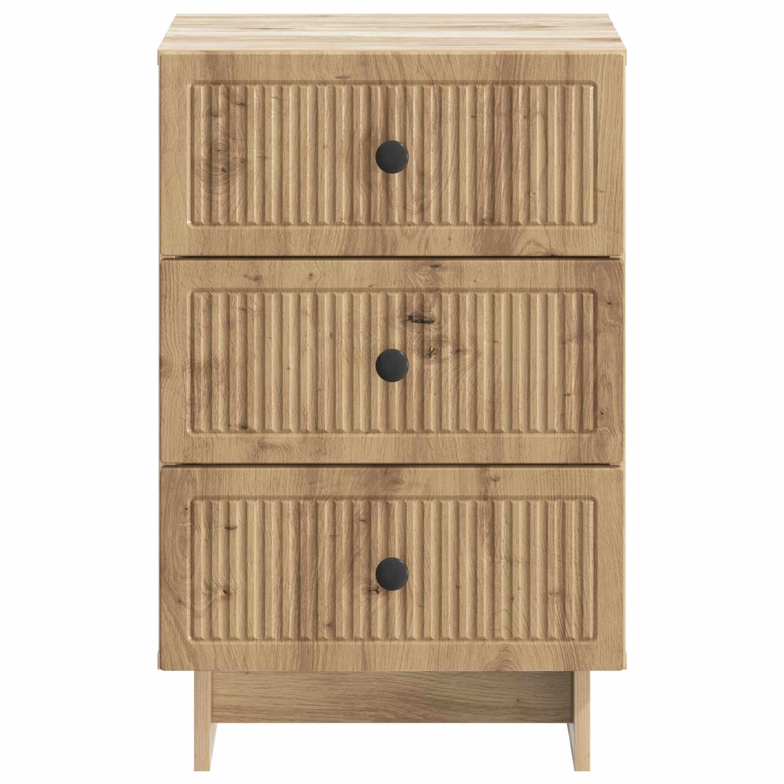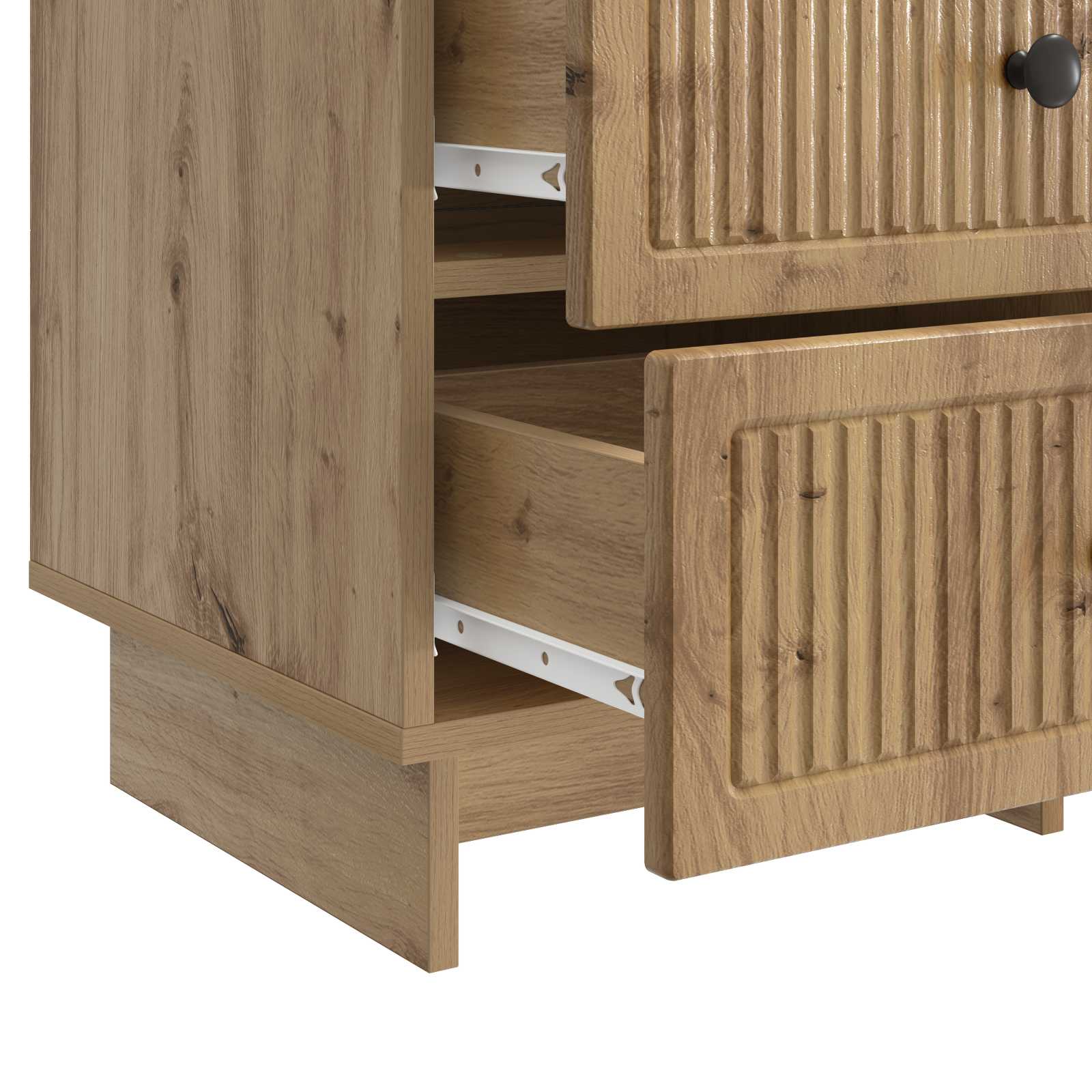 Ta moderna nočna omarica združuje vintage stil s sodobnim dizajnom in je popoln dodatek k vsaki spalnici. Ima lepo retro obliko, ki ponuja veliko prostora za shranjevanje ter funkcionalno eleganco, kar olajša ureditev prostora. Njena elegantna zasnova in brezčasen videz se brez težav prilegata katerikoli postelji in izboljšata vzdušje v sobi. Struktura iz inženirskega lesa: Kakovosten inženirski les zagotavlja dolgotrajno in moderno izgledanje. Odpornost na praske in vlago omogoča vsakodnevno uporabo in ohranja estetski videz. Obilen prostor za shranjevanje: Prostorni predali so odlični za shranjevanje vaših pomembnih stvari, ki so vedno pri roki. Predali gladko drsijo in lahko sprejmejo knjige, tehnologijo ter osebne stvari. Elegantni kovinski gumbi: Črni kovinski gumbi dodajo eleganco, ki dopolnjuje vintage dizajn. Ti ročaji zagotavljajo enostaven dostop do shranjenih predmetov in izboljšujejo videz omarice. Vsestranski dodatek za spalnico: Ta nočna omarica se prilega različnim stilom in je prilagodljiv kos, ki se zlije s sodobnimi ali retro postavitvami. Njena brezčasna zasnova in praktičnost jo naredijo privlačno v vsaki spalnici. Enostavna navodila za nego: Minimalno vzdrževanje je potrebno; obrišite jo z vlažno krpo in se izogibajte močnim kemikalijam, da ohranite njen videz.