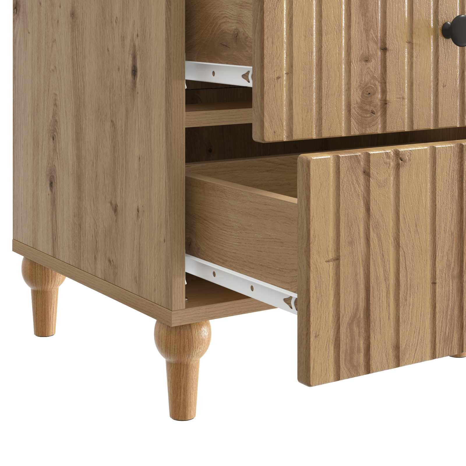 Ta moderna nočna omarica združuje stil in funkcionalnost, kar jo dela idealno za minimalistične prostore. Zasnovana je tako, da izboljšuje bivalne in spalne prostore, s svojim elegantnim pravokotnim oblikovanjem in vsestransko uporabnostjo. Z dovolj prostora za osnovne potrebščine, kot so luči in budilke, se brez težav prilega tudi na manjše prostore. Izdelana je iz inženirskega lesa, kar ji daje zanesljivost in dolgotrajnost, hkrati pa ostaja estetsko privlačna. Njena zasnova omogoča enoren prehod med prostori, bodisi kot elegantna nočna omarica, bodisi kot praktična rešitev za shranjevanje v dnevni sobi. Inženirski les: Omarica je narejena iz vrhunskega inženirskega lesa, znanega po svoji dolgotrajnosti. Ta material je cenovno ugoden in preprečuje hitro obrabo. Njena gladka površina daje moden videz in olajša čiščenje. Robustni kovinski ročaji: Predali so opremljeni s kovinskimi ročaji v črni barvi, ki združujejo trajnost in stil. Ti ročaji omogočajo enostaven dostop do vsega, kar potrebujete. Njihov poudarjen dizajn dodaja omarici na sodobni privlačnosti. Funkcionalni drsni predali: Predali so zasnovani tako, da omogočajo enostavno odpiranje in zapiranje ter zagotavljajo brezskrbno shranjevanje. Idealni so za knjige, recepte ali osebne predmete. Prilagodljive možnosti postavitve: Lahko jo uporabljaš kot stransko mizo ali nočno omarico. Njena kompaktna velikost in nevtralna zasnova se brez težav prilagajata različnim okoljem. Ta omarica je odlična izbira za tiste, ki cenijo tako stil kot funkcionalnost. Enostavno vzdrževanje: Pomembno je, da omarico zlahka obdržiš čisto – le obriši jo z vlažno krpo, da odstraniš prah. Ta enostaven postopek zagotavlja, da ostane brezhibna in elegantna skozi dolga leta uporabe.