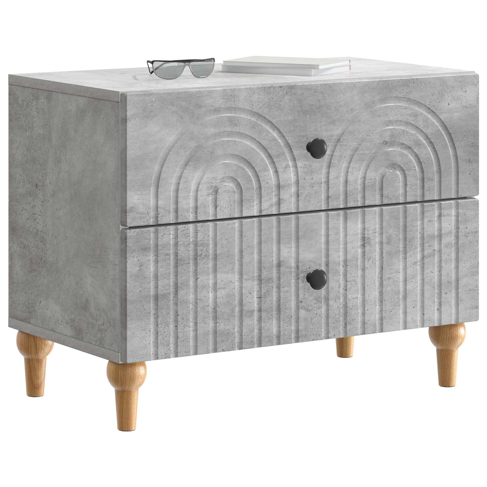 Ta elegantna nočna omarica prinaša moderni stil s svojim pravokotnim dizajnom in črtastim vzorcem. Popolnoma je zasnovana, da doda funkcionalnost in šarm v dnevno sobo ali spalnico, deluje kot odličen spremljevalec postelje, nudi rešitve za shranjevanje ter se lepo ujame z estetiko prostora. Njena minimalistična, a stilizirana oblika se brez težav prilega različnim dekorjem, zaradi česar je vsestranska za sproščene in sofisticirane prostore. Subtilna struktura iz inženirskega lesa daje občutek kakovosti in stabilnosti. Konstrukcija iz inženirskega lesa Ta omarica iz kvalitetnega inženirskega lesa nudi trdnost in privlačen izgled. Izbira materiala zagotavlja, da ostane trda in odporna na vsakodnevno obrabo, kar pomeni zanesljivo službo še dolga leta. Obilne možnosti shranjevanja Zasnovana s predali in elegantnimi gumbi, omarica nudi prostoren prostor za osebne stvari in dodatne potrebščine. Ta dizajn spodbuja organiziranost, kar jo naredi praktičen dodatek k vsakemu domu. Sofisticiran moderen stil Moderna, preprosta zasnova z unikatno črtasto obrobo zagotavlja, da se nočna omarica brez težav prilagaja prostorom z minimalistično estetiko. Zasnovana za uporabnost Ta omarica izboljšuje funkcionalnost prostora. Njena kompaktna velikost omogoča, da se prilega ob posteljo, hkrati pa nudi dovolj površine za svetilke in budilke. Enostavno vzdrževanje Da bi ohranili videz kot nov, preprosto obrišite z vlažno krpo, kar omogoča brezskrbno nego za zaposlene lastnike domov.